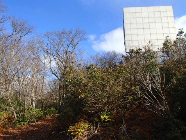 ・合流点からゆっくり登って行くと岩茸山に着きます。さほど疲れていないのでそのまま進むとえらくしっかりした道になります。疑問に思っていると前方に電波反射板。どうやらこの施設の為の道の様です。