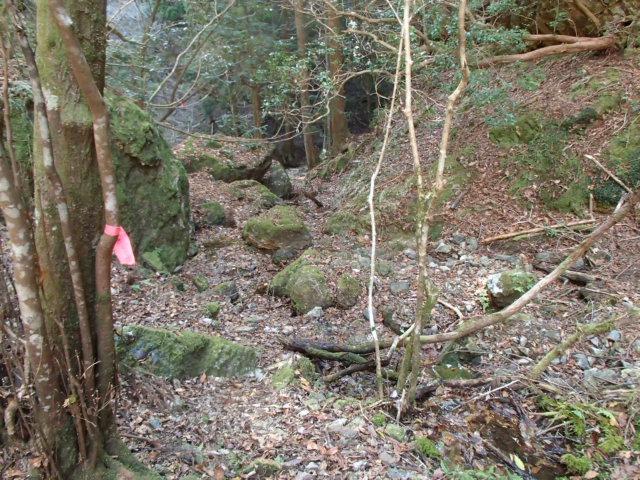 ・しばらく歩いてもナベクロ峠への道標が見当たらない。踏み跡はしっかりついているので間違いないが、何となくコースを外している気がして不安になってくる。途中に合った吊り札のある地点まで引き返して地図を確認するも位置がイマイチ分からない。ふと、矢印の書いてある吊り札を見ると、裏に「ナベクロ峠」と書いてある・・・。やってもた。