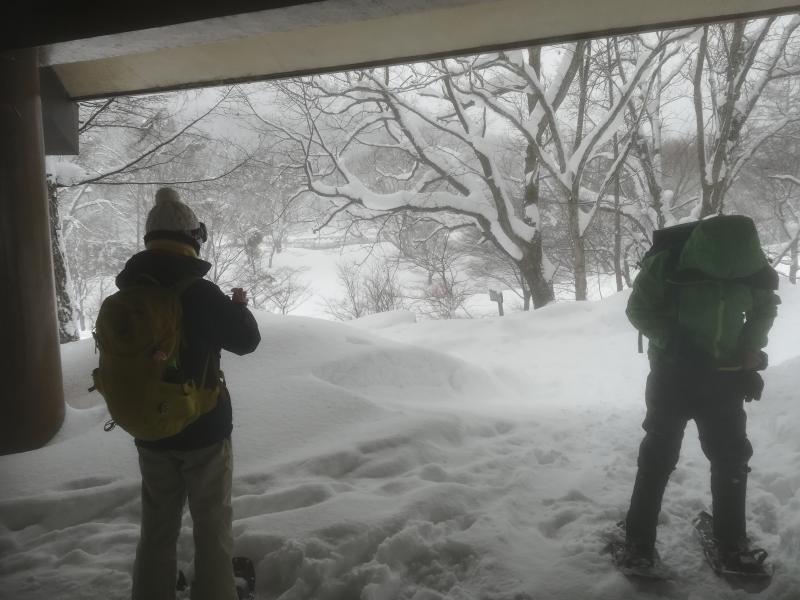 準備ができたら出発。スキー場方面に歩いていくと右手に登山口があります。今回は雪が多いのでここからスノーシューをつけました。屋根がある東屋があるので助かります。