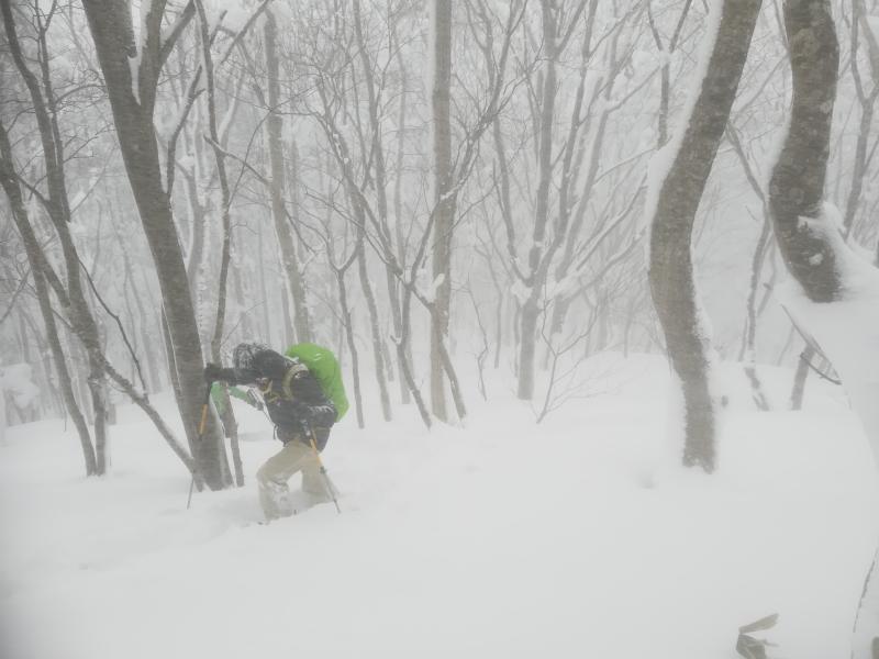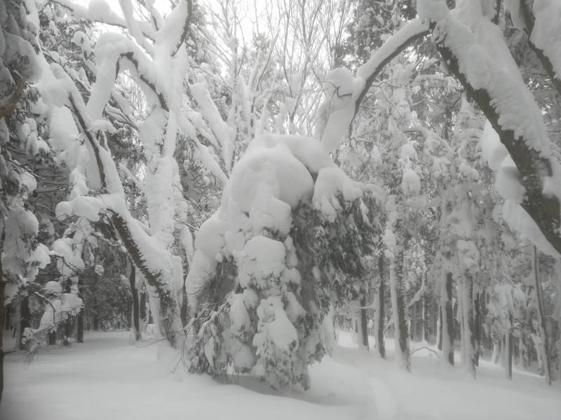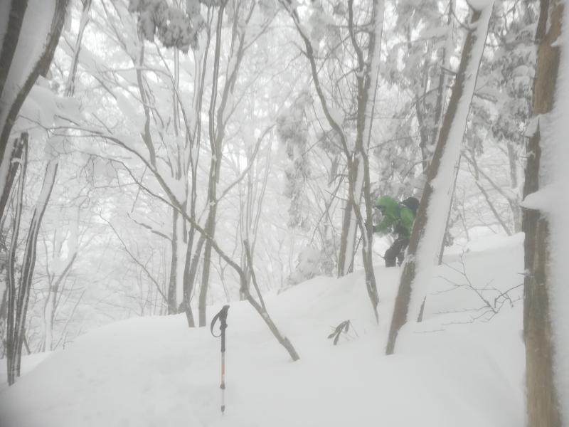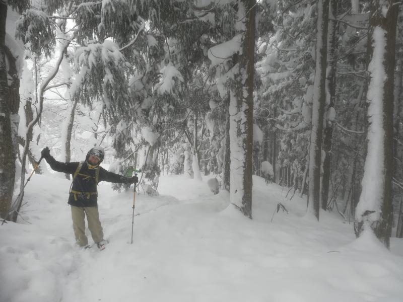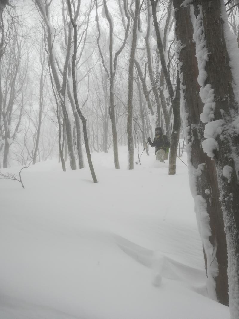 樹林帯の中で、雪崩の心配がなかったので、トレースを外れ新雪を滑るように下山しました。