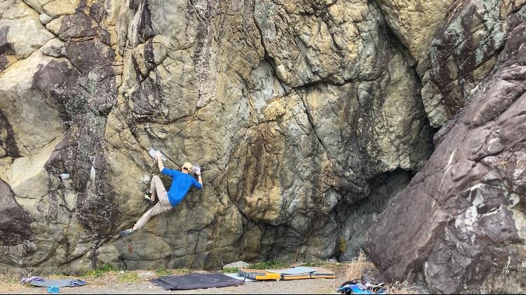 ハイキングだけではもの足りなかったので、帰り道、ボルダリングエリアである大山岬に立ち寄り、1課題だけ登って帰りました。