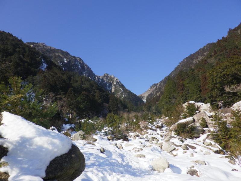 今回はバリエーションルートである藤内沢から上がり、中道で下りました。藤内沢は夏は狭く急峻で登りにくく、冬は雪が着くと登りやすくなり、上部でアイスクライミングする為のアプローチとして使われます。