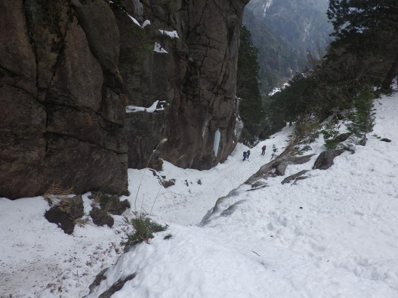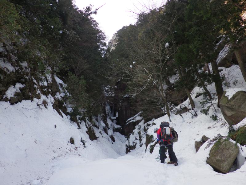 今日は久しぶりに裏道で登っていきますが、藤内小屋上から見る上部は快晴で最高のコンディションと思われました。急ぐこともないので出発自体も遅く、ハーネスやアイゼン装着のために休憩した藤内沢出合ではさらに後発のガイド登山パーティーにも抜かしてもらいました。藤内滝はガイドパーティーが滝下の右岸を登っていたので、私たちは手前の樹林帯から回り込み先回り、ここのトラバースも雪がしまっていて問題なく、滝上へ。