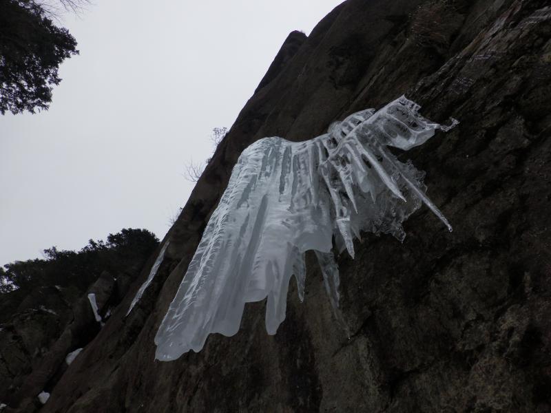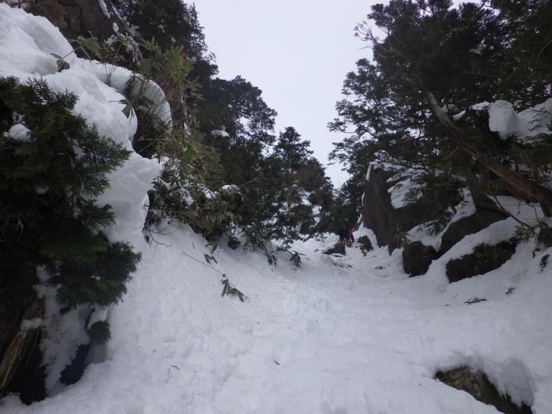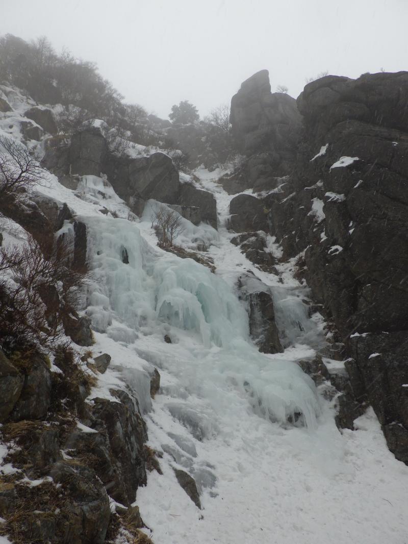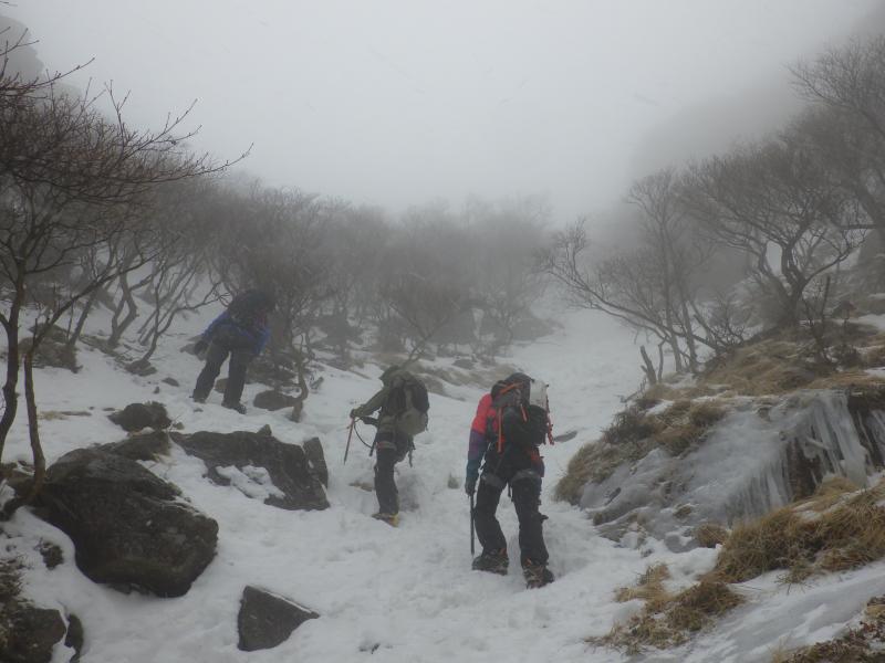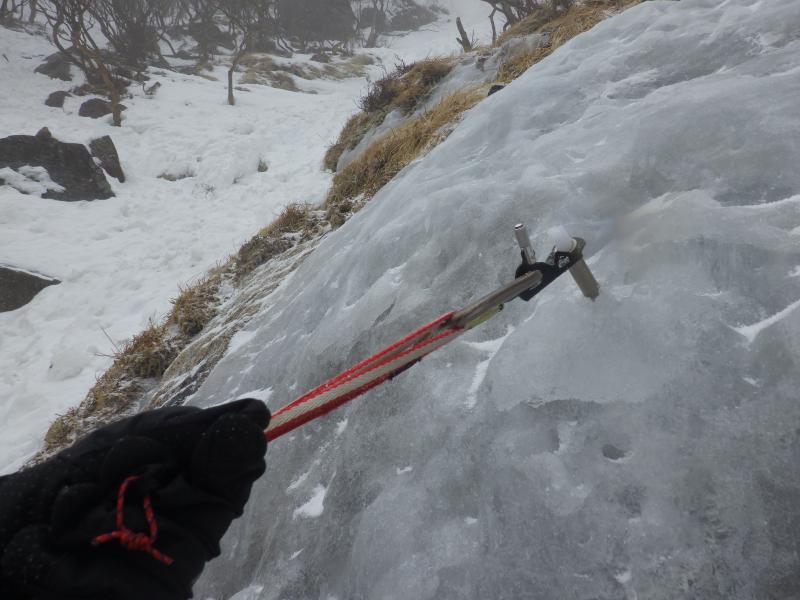 次のコウモリ滝も昨年は雪が多くて埋まっていたようですが、お助けスリングが出ていたので1ステップで難なく超えられました。この先は急になりますが、立って歩けるくらいなので、問題なく、前尾根を背にしてステップを切ってひたすら登るのみ。3ルンゼ手前から雪が激しく降ってきて、視界も悪くなってきましたが、3ルンゼで持ってきたアイススクリューで少しだけ遊んだ上で、寒いので登山道へすぐに抜けました。この区間で樹氷を期待しましたが、皆無。