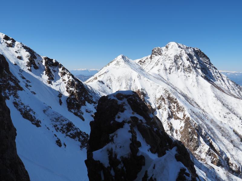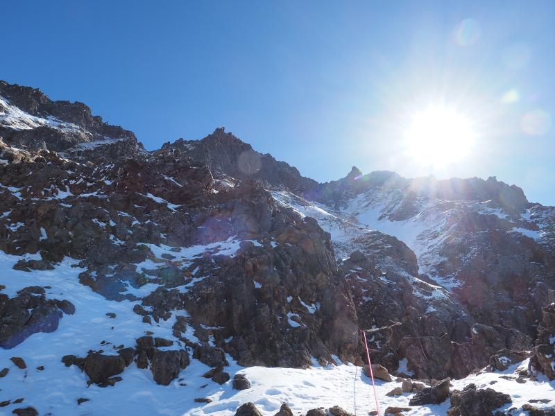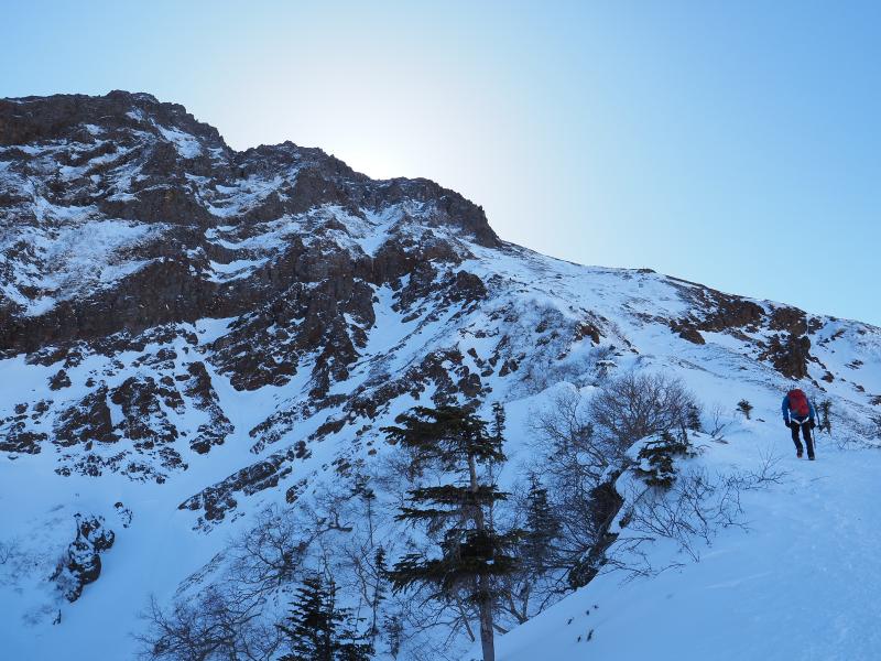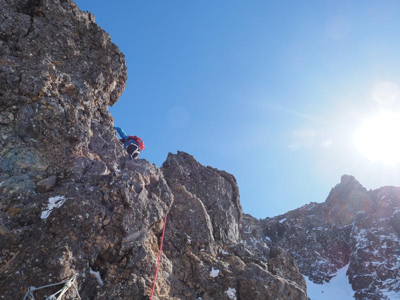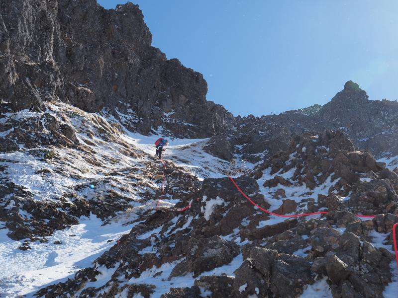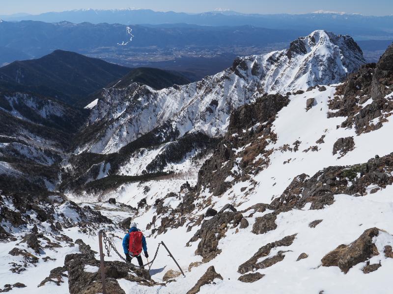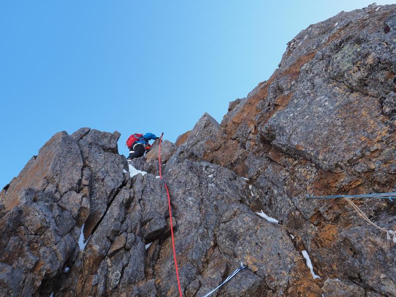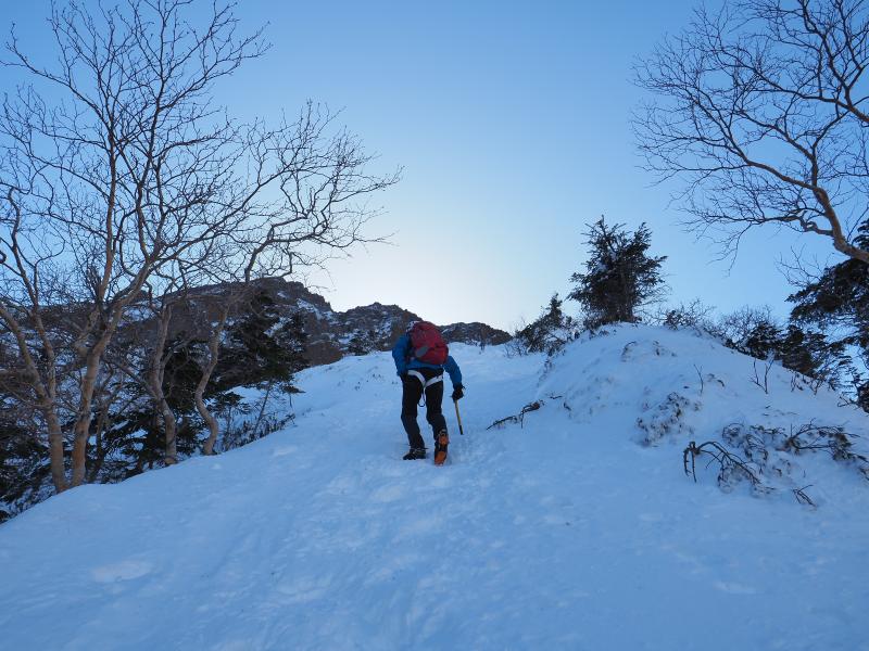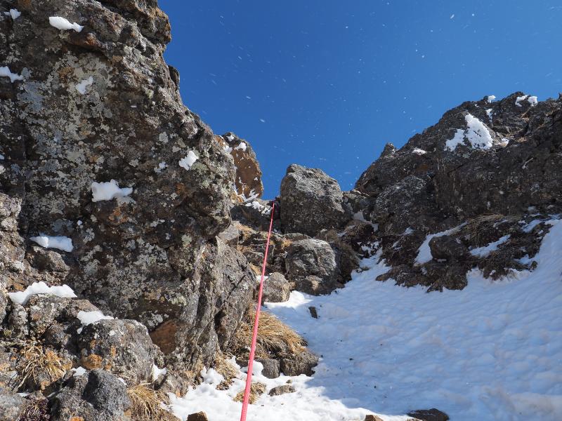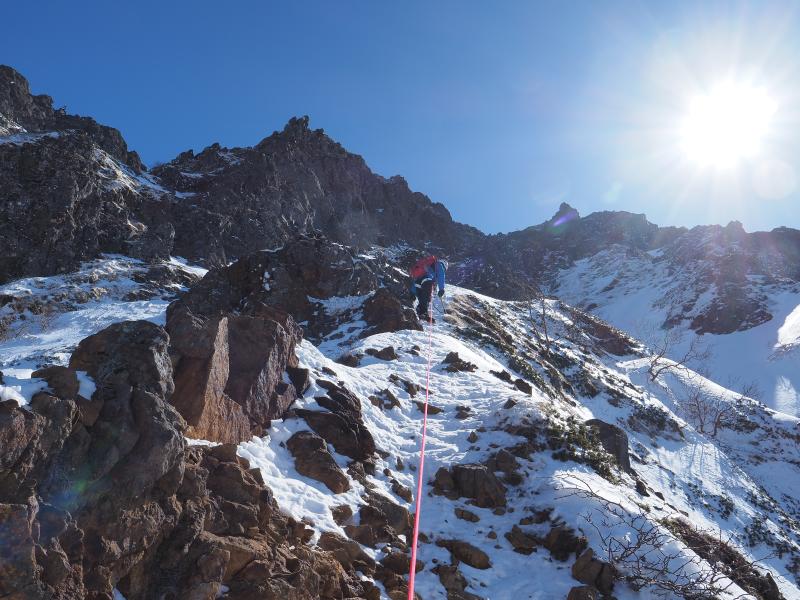 雪山はいつも歩きばかりなので、アイゼンで岩を登る感覚がなかなか慣れませんがなんとなく感覚は掴めてきた気がします。今回は岩場の雪が少なく岩を掴んで登るところも多かったのでシングルアックスが邪魔にならず快適でした。雪の付き方によってはもう少し難易度は上がるかと。