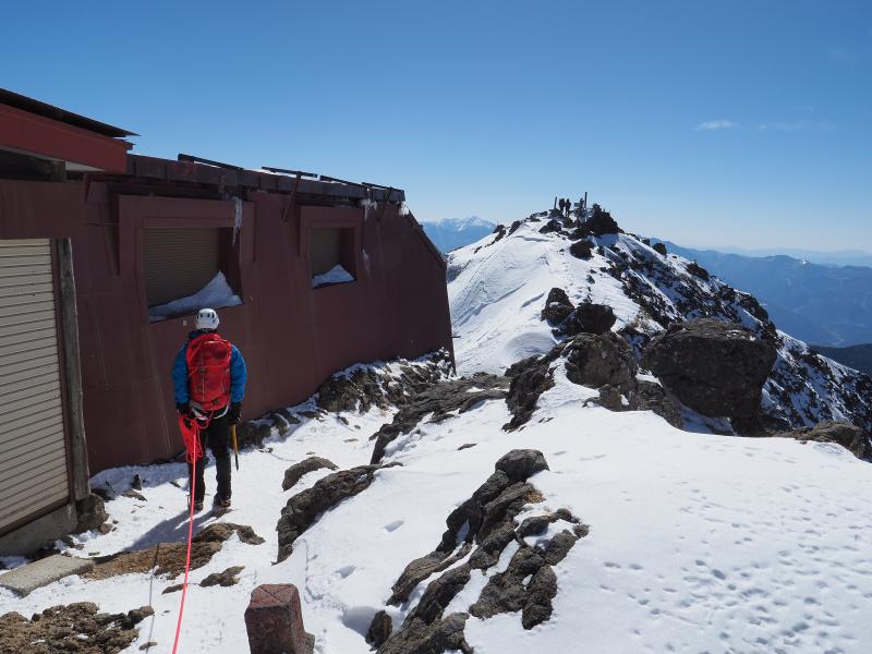 トラバースに入る前にロープ繋ぎ、取り付きまではいやらしいトラバース。いよいよ主稜登ります。先輩はスイスイ登って行きますが、1ピッチ目の登り始めのチョックストーンがボルダリングのようで結構難しく、どう3点支持を取るか悩み…なんとか突破。その後も岩が続きます。2ピッチ目も岩登り。1ピッチ目の最初よりは快適に登れます。阿弥陀岳は太陽が当たって快適そうですね。3ピッチ目は雪稜歩きのようで、上部は草付きでしたがダガーポジションを多用しつつ、コンテで進みました。4ピッチ目はまた岩登り。チムニー的なところもあり、岩を掴んで登ったり、ピッケルを使って登ったり。5ピッチ目は草つきの岩場でちょっといやらしい感じでしたがコンテで上がり、そのまま赤岳北峰へ。あとは南峰へ。久々に快晴の赤岳山頂に立てました!あとは文三郎尾根で行者小屋へ下ります。
