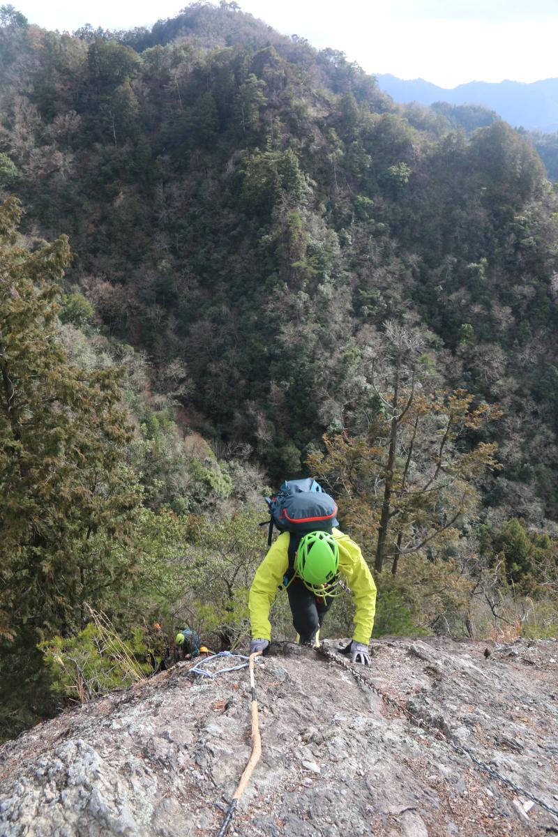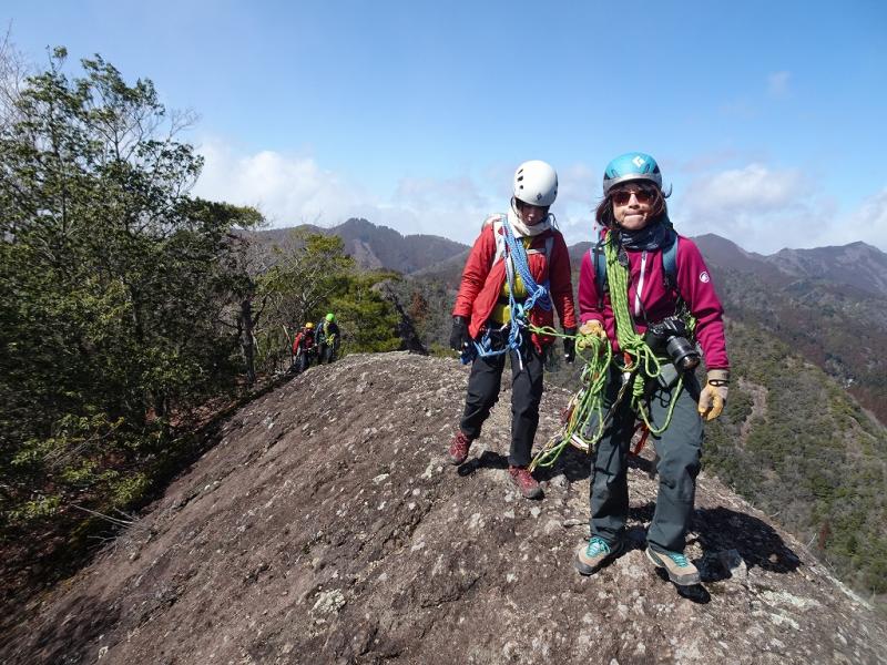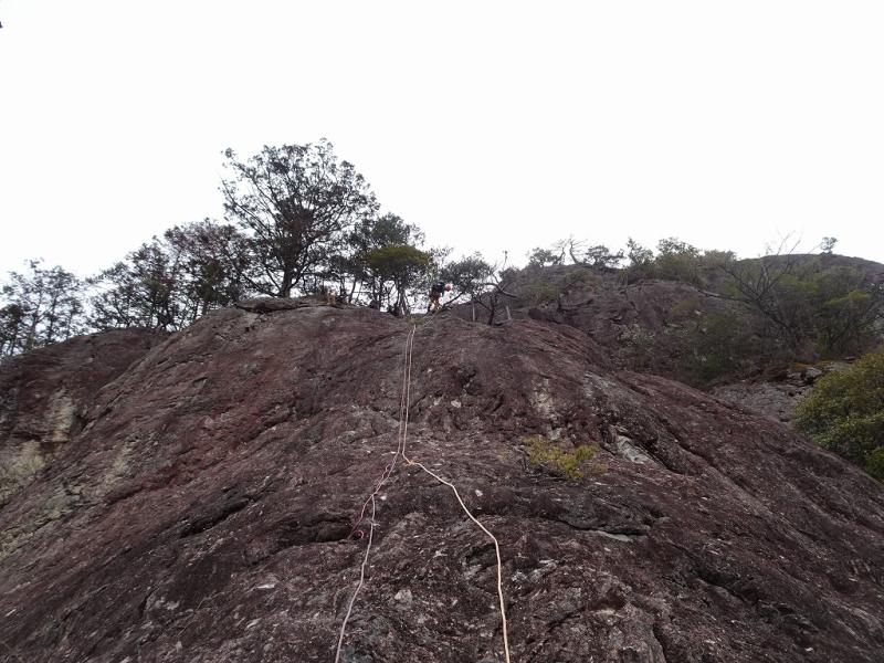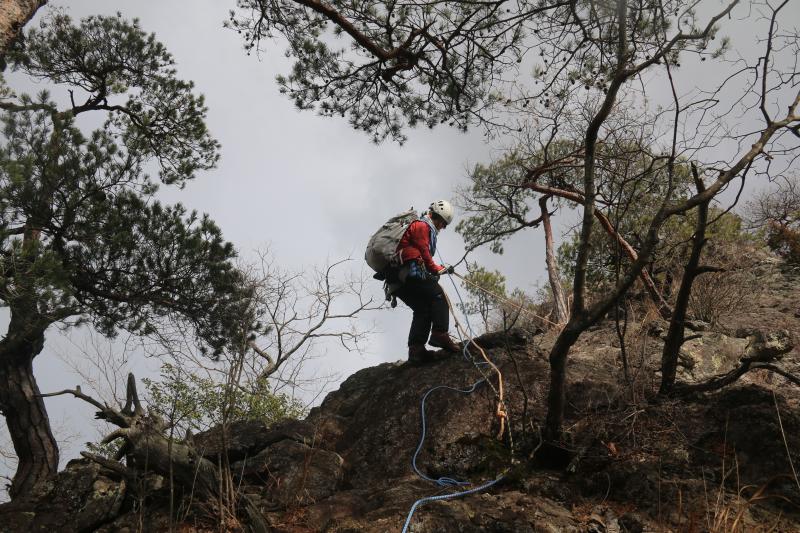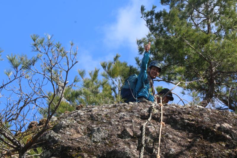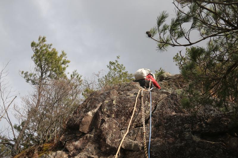 切れた岩場の登りはスタカット、ロープも張ってで登ってもらいます。
