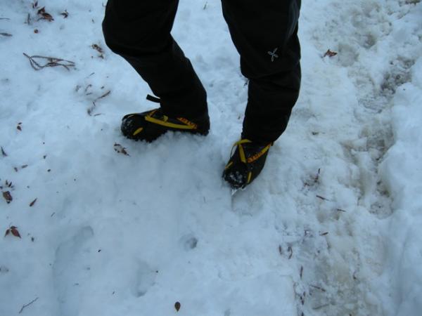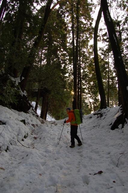 スキー場跡に出るまでの樹林帯にもわずかに積雪がありました。アイゼンがないと歩きにくいです。