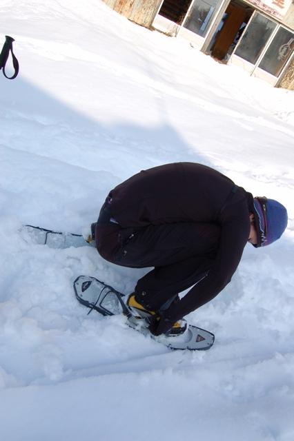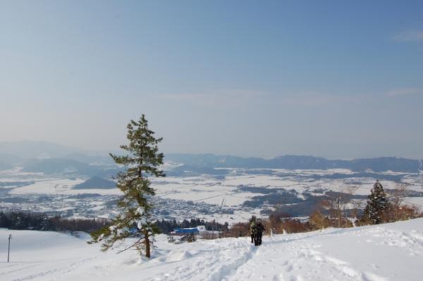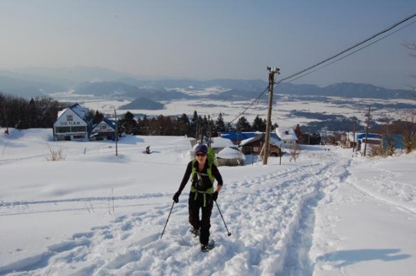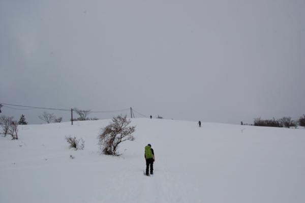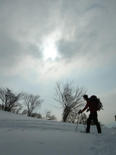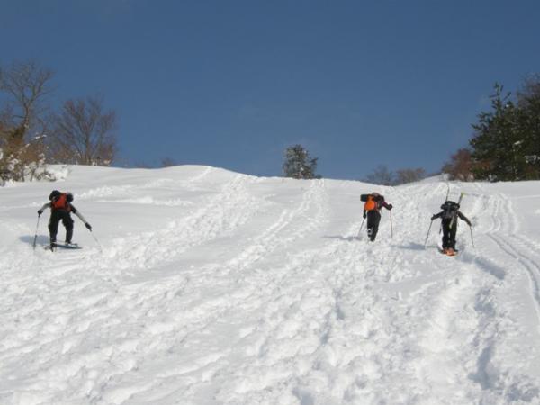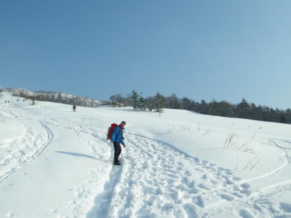 スキー場に出てからは膝丈くらいの積雪。スノーシューを着けての登行に切り替えましたが、思いのほかトレースが固められていたため、アイゼン歩行の方が断然楽でした。もちろんトレースのない所ではスノーシューの性能を十分味わえるので、楽しみたい方はぜひ。