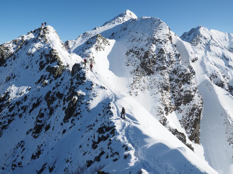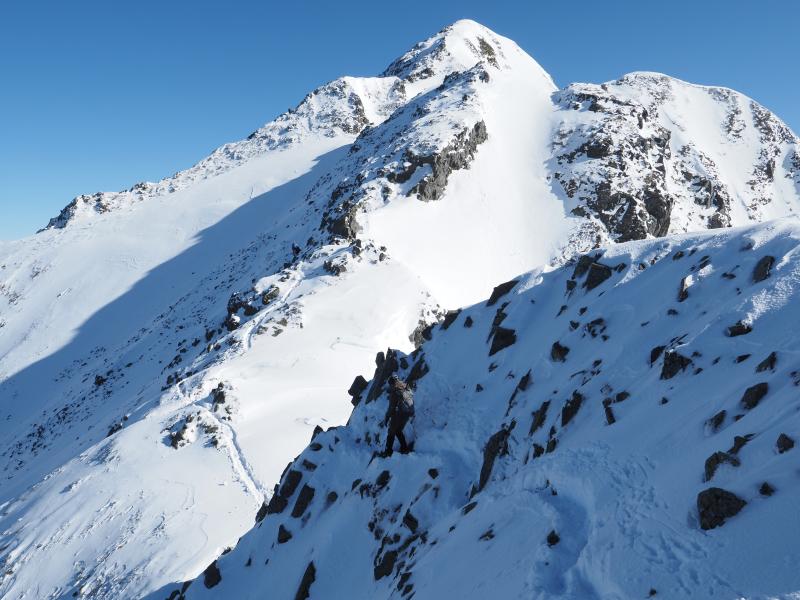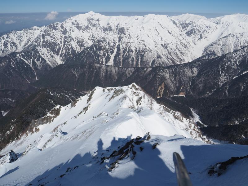 独標からの下りは少々急ですが、クライムダウンするほどではありません。一歩一歩慎重に下ります。その後も岩場が続きます。すぐにピラミッドピークに到着。ピラミッドピークから先は若干足場が狭くなります。先行している人たちに追いついてきました。岩場のトラバースが続きもう少しで西穂高岳山頂。噂の最後の登りはなかなか急ですが、トレースありの雪も締まっているので歩きやすい。そして念願の西穂高岳に登頂!なんだかんだ無雪期も来たことなかったので初登頂ですね♫山頂は風もなくおだやか。笠ヶ岳はずっと見えていましたが、黒部方面、槍ヶ岳、大喰岳、南岳、涸沢岳、ジャンダルム、前穂高岳、明神岳と大展望。奥穂高岳はジャンダルムに隠れて見えないんですね。こんな安定した天気の中、素晴らしい景色が見れて幸せです。記念撮影と大展望を楽しみ、もっと山頂に居たかったですが下山します。下りは歩いてきた稜線に焼岳、乗鞍岳、霞沢岳がよく見えます。下りも一歩一歩慎重に。