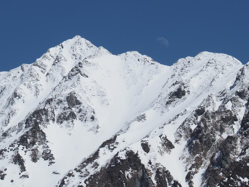 山頂は風が全然ありませんでしたが、独標に戻ってくるとちょっと風がありますが気温も若干上がってきたのでウェア調整。独標周辺も過ぎればあとは緩やかな下り。山荘にデポした荷物を回収してロープウェイ西穂高口駅へ下山〜。最後、西穂高岳の横に月が見えていました。