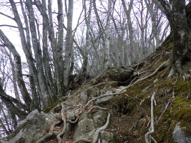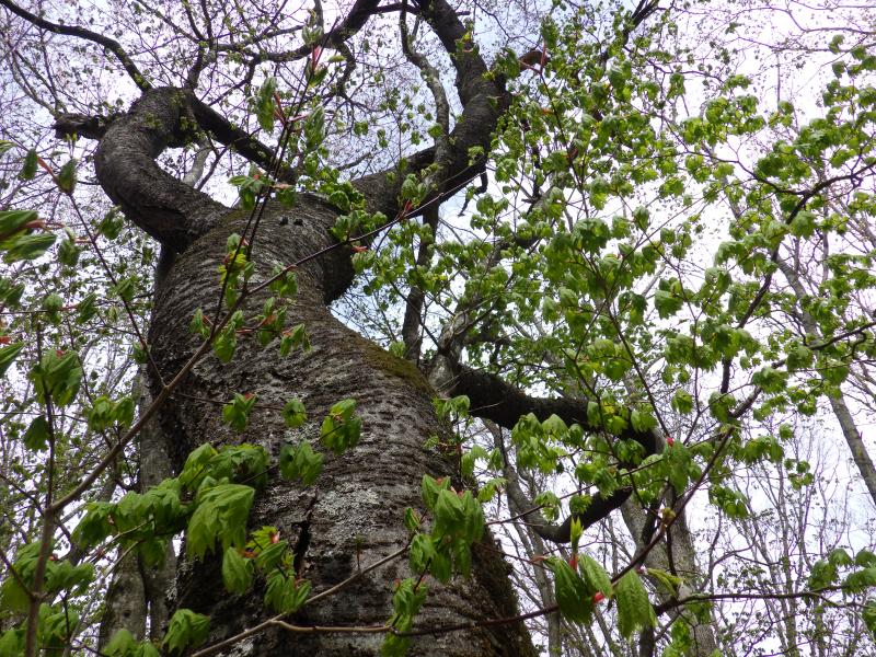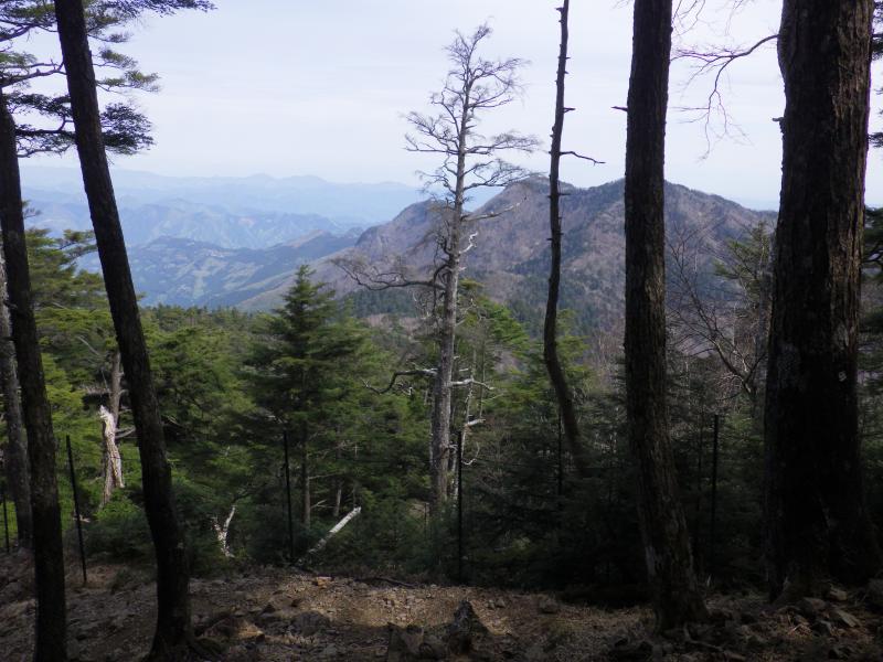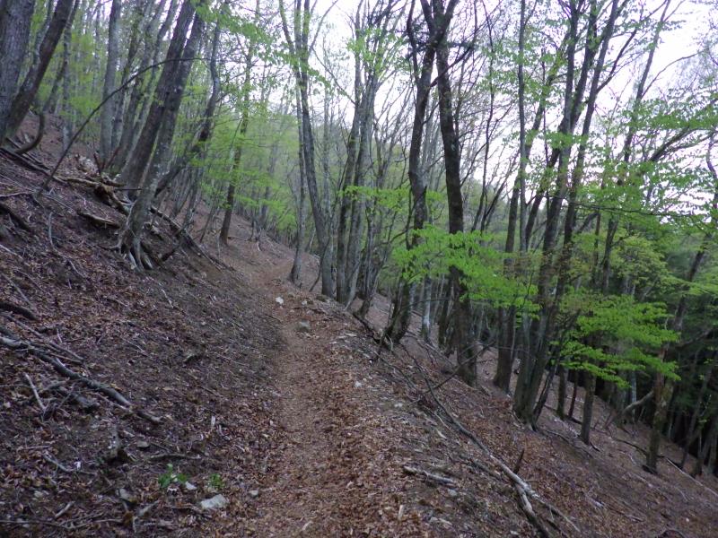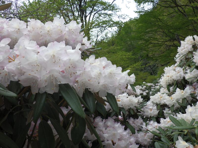 雲取山はどのコースも距離が長く、三峯コースも往復で20kmと1泊2日で行きたい所ですが、日程に余裕がないので朝早く出発しての日帰りです。三峯神社周辺ではアズマシャクナゲが早くも満開でこれは帰りに見るとして、その先の新緑も見事です。前半は巻道が多く、楽に歩けて距離も稼げ、前白岩山のヤセ尾根の急坂区間以外はテンポよく進めます。