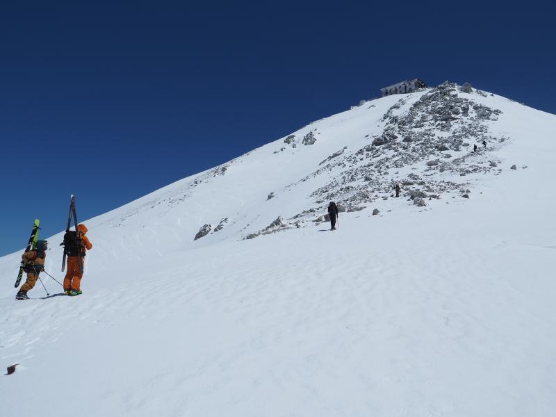 室堂を出てすぐ雪があります。まずは一ノ越を目指します。一ノ越手前はそこそこ急になるので最初からアイゼンを付けて歩きました。徐々に斜度が出てきて、一ノ越周辺から風が強く寒い。1日目の午前中は標高3000m付近で10m/s以上の予報。雄山への尾根も風で雪煙が舞っているので一ノ越山荘の裏で風を避けながらピッケルや防寒対策など準備。雄山へは岩が出てるところも多いのでアイゼン引っ掛けないように注意。BCの人も登っています。なかなか急で息が上がってしまいます。ようやく雄山に到着。登ってきた尾根に比べて山頂付近は微風。快晴で周りの山々 後立山、最深部、南部、そして富士山、白山も見えていました。雄山神社の鳥居は雪に埋まっていました。大汝山や剱岳、奥大日岳もよく見えています。景色を楽しんだので戻ります〜。雄大な景色の中、室堂へ大荷物を回収しに行きます。室堂の中は観光客の混雑でカオス!