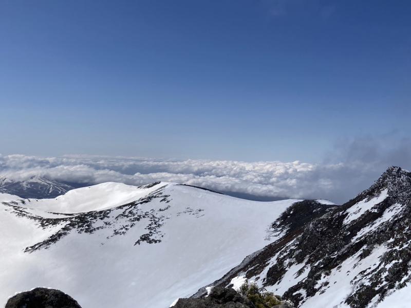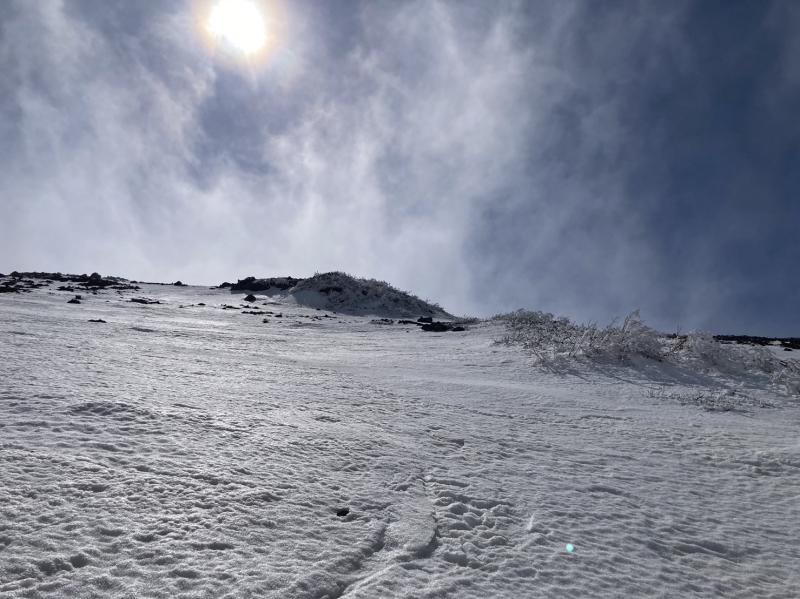 登り始めこそ、雪がないので板を履かずに歩きましたが、