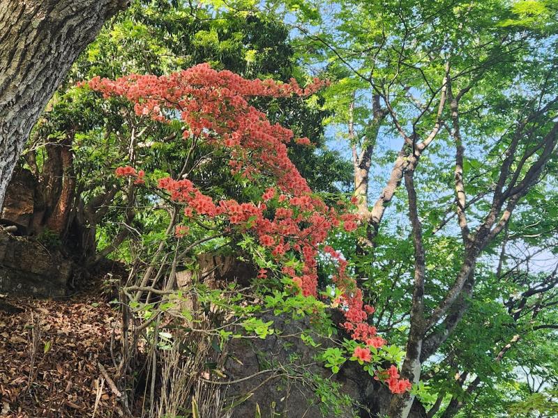 伊豆ヶ岳は去年の今頃ツアーで同行した山ですが、こんなにキツかったかしら?急登に喘ぐこと数十分、やっと山頂にたどり着きました。赤いヤマツツジを愛でながら休憩したら、後は正丸駅まで下るだけ。といっても下りもやはり急なので、転ばないように慎重に歩きました。