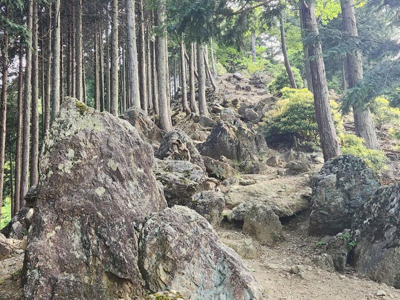 新緑がきれいな登山道をのんびりと快適に歩いていましたが、いつの間にか足下が急になり、すれ違う人もトレッキングポールを駆使しながら慎重に下ってきました。