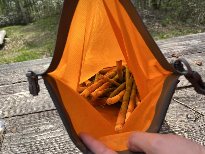 見つけたタケノコは手でポキッと折って、EXPEDの『DRY BAG』にどんどん入れていきます。
