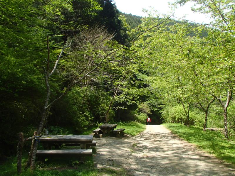 ・林道を歩いて堰堤広場へ。前回はここの時点でコースを間違えた・・・。左へ上がってしまったので花畑に行けなかった・・・。まぁ、おかげでキイロスッポンタケに出合えたんですけどね。今回は間違わずに右側へコースを取りました。