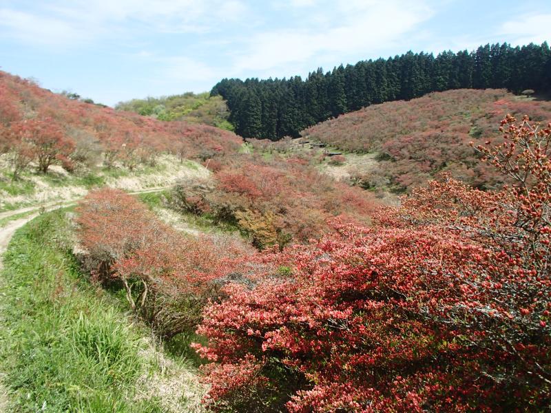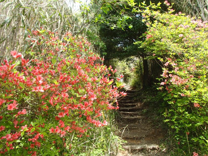 ・ツツジが見え始めると山頂も近い。何とか階段状の道を登り切り、ツツジ園へ向かいます。途中にあるパラグライダーの出発場所で展望を楽しんでからツツジ園に着くと、少し早いものの、結構ツツジの花を楽しめる2分咲き位の状況でした。あと1週間から10日先が見頃かも知れません。