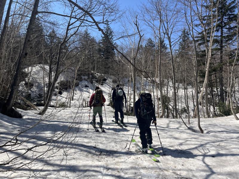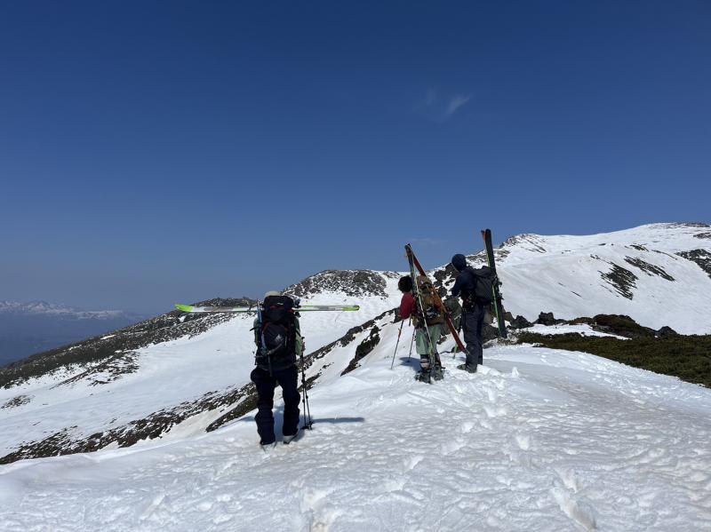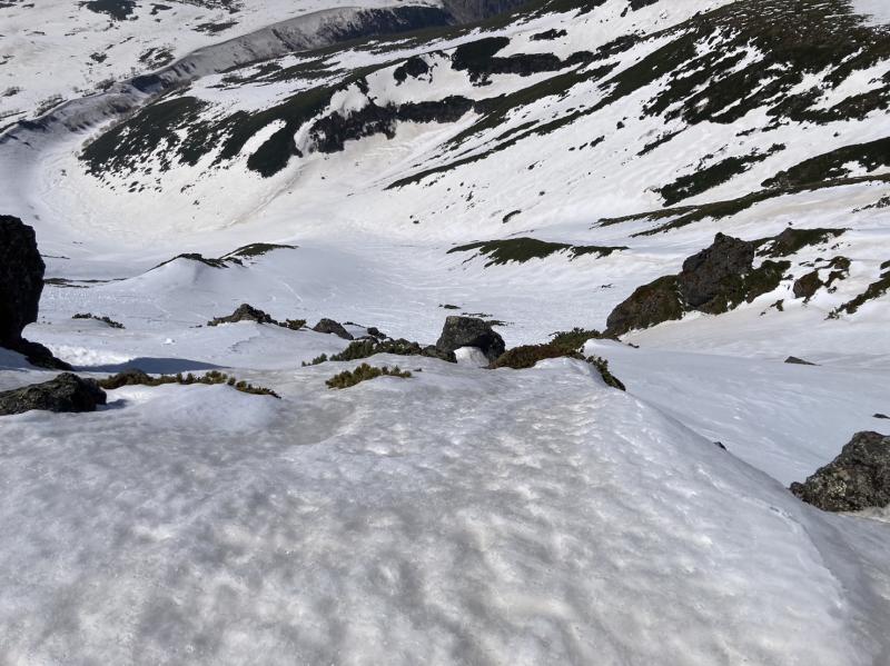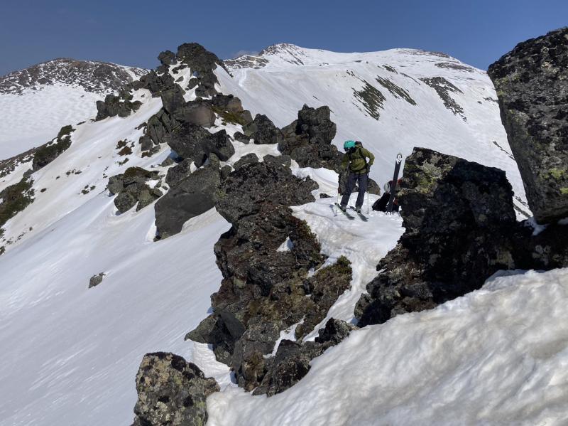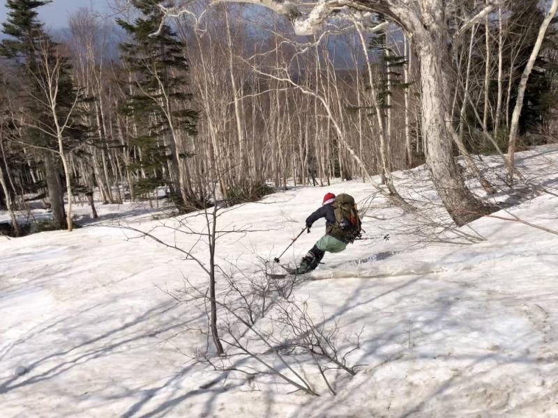 稜線に出たところで、当麻岳のピークまで行かずにドロップ。