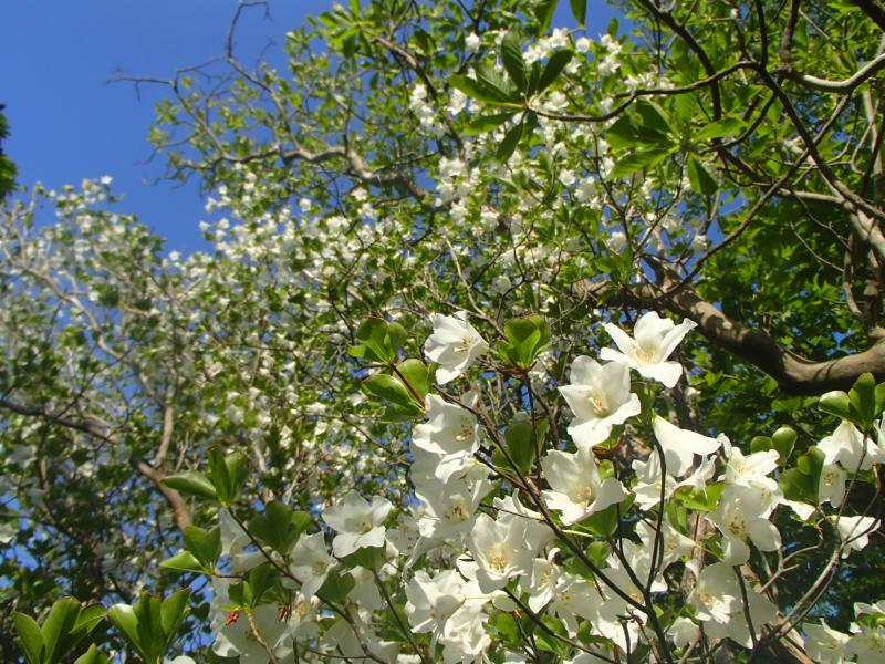 ・もう少しいろんな角度から「白いヒツジ」を楽しみたかったので、遠足尾根分岐方面へ足を延ばしてみることに。一旦下りながらじっくり「白いヒツジ」を観察。結論としては、山頂付近が観察には一番いいポイントだと納得。分岐付近のシロヤシオの花の下で小休止です。