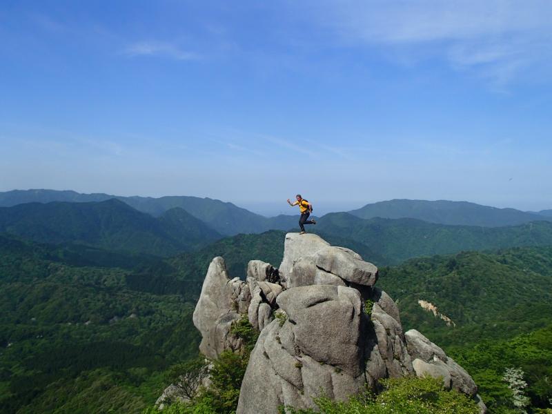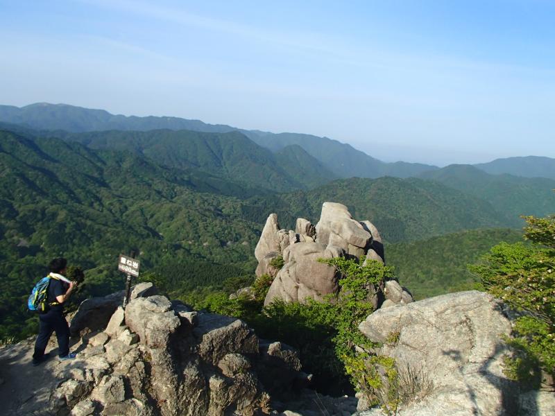 先行の登山者の方々が重ね岩に腰掛けで写真を撮っているのを見ての一言。高所恐怖症なのを知っているくせに・・・。とはいえ大阪人、ここは引けないので、やせ我慢して指令通りのポーズをとり、何とかお許しを頂き終了。汗出るわ!!