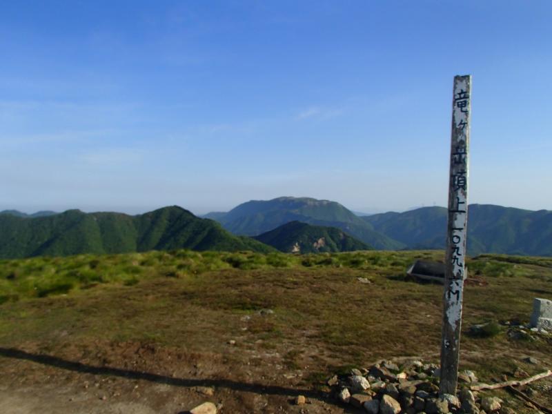 ・重ね岩から30分ほどで広々とした竜ヶ岳の山頂に着きます。ここから念願の「白いヒツジ」が満喫できます!!思ったより真っ白では無かったものの、確かに「白いヒツジ」が左から右へ走っている様に見えます。ネットにあったコメント「白いヒツジが放たれた!」は言いえて妙な例えだと感心しきりでした。