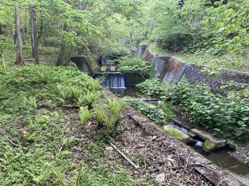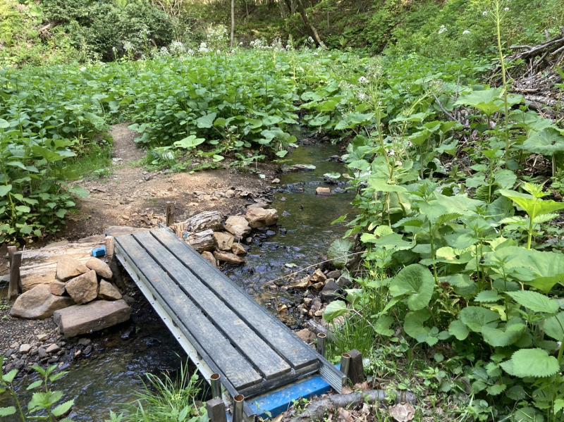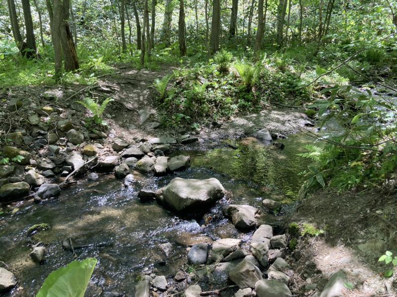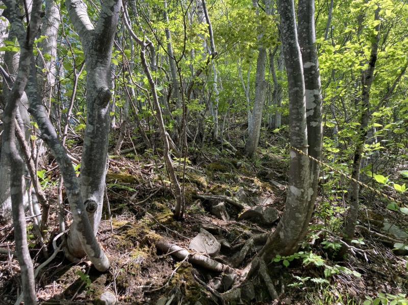 一度作業道を渡るとその少し先で、東側と西側にルートが分かれます。