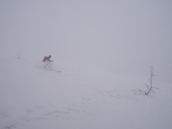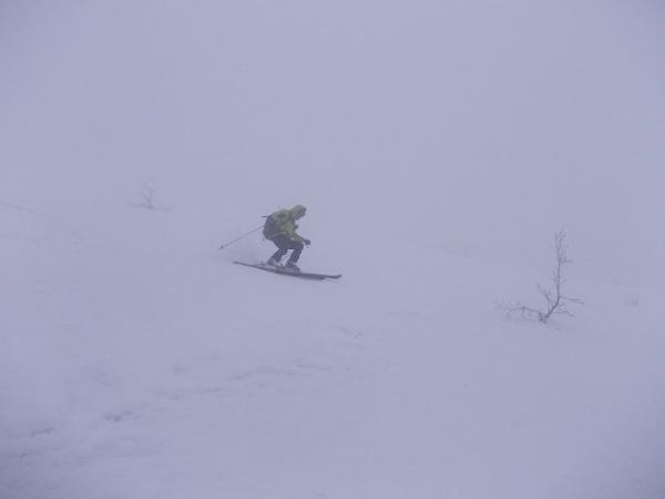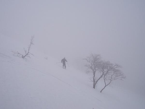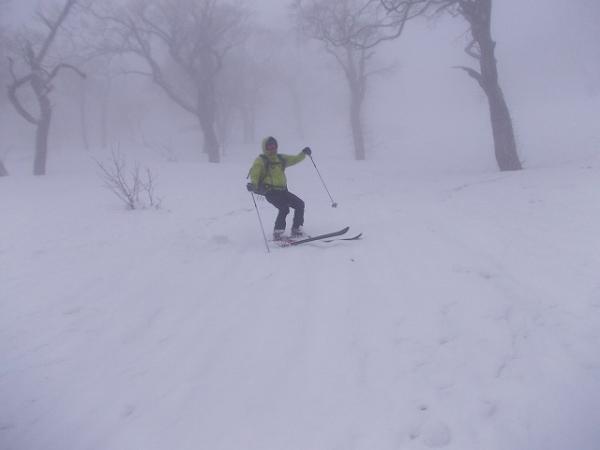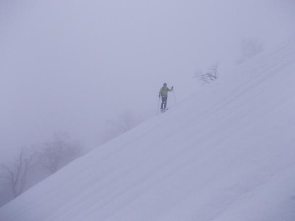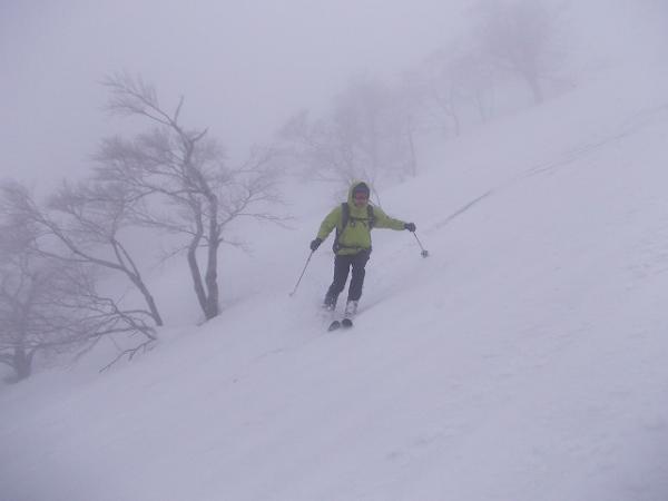 で 滑り出すと・・・案の定滑りにくい、傾斜もきつく視界も利かない・・・「根性」でスキートップを下に向け滑り落ち?ます