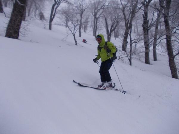 傾斜がゆるくなったところからは、気持ちの良い滑りが出来ます、登りのトレースを見つけ、そのトレースに乗り