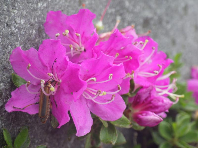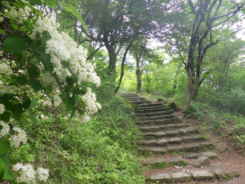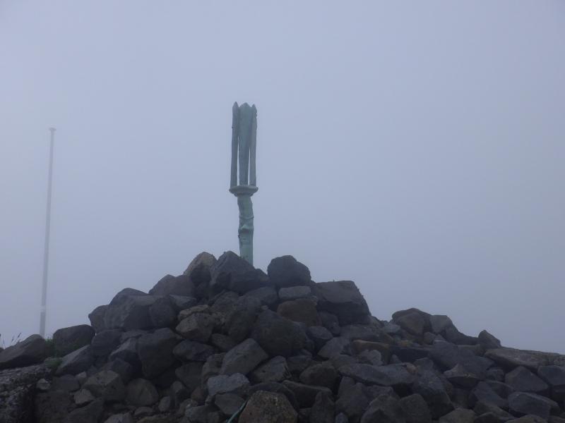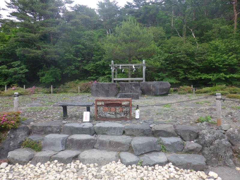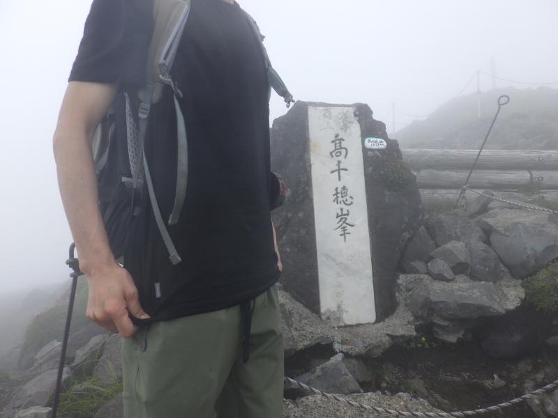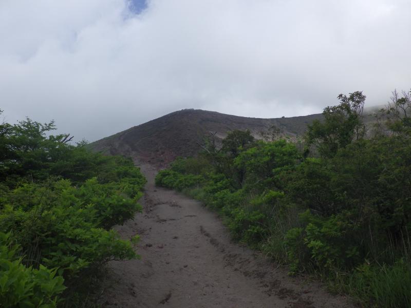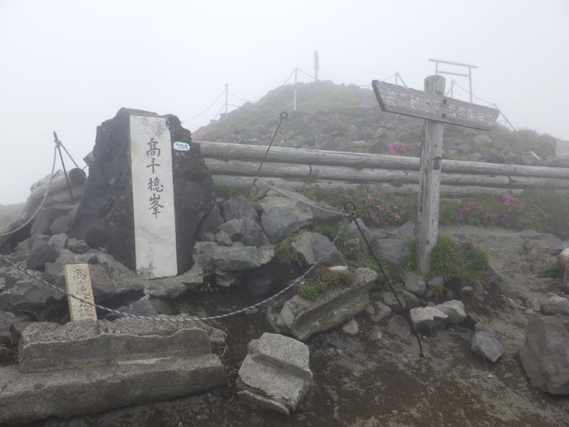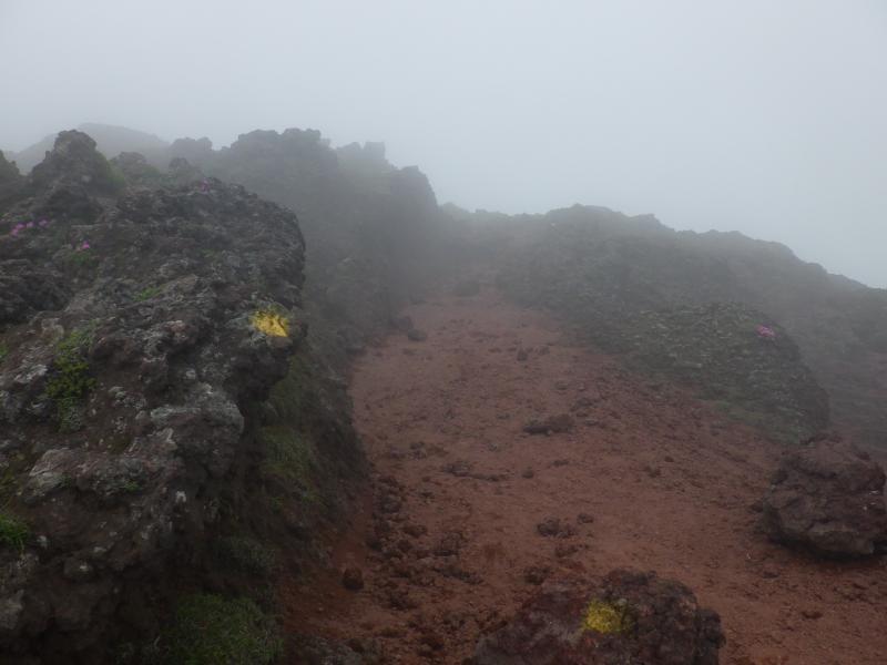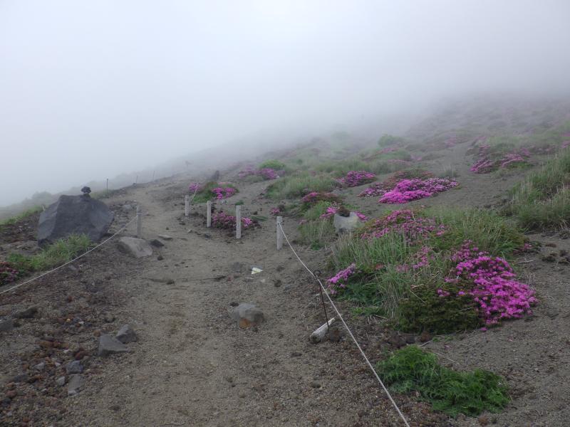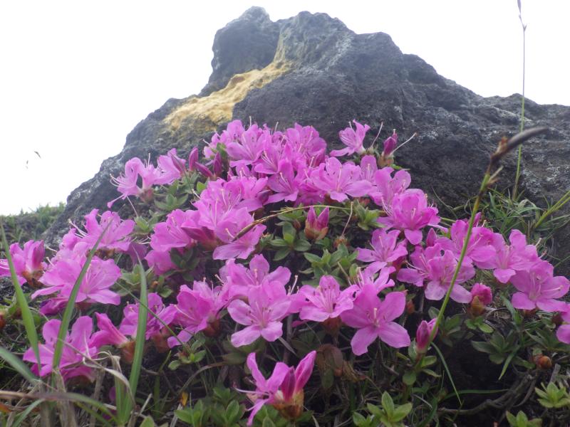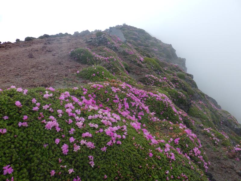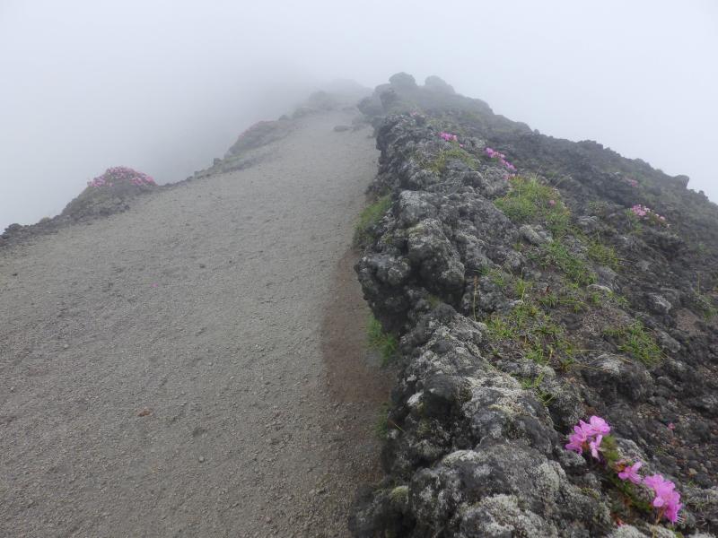 今日は二座目、天候が怪しくなりそうなので足早に進む。14時頃なので、さすがにこの時間は下山してくる人が多い。森を抜けると、火山特有の赤いザレ場になり、途端に歩きにくくなります。まだ稜線が見えていて、お鉢への登りが見えていましたが、これがなかなか進まない。暗い中でも所々、岩場に咲くミヤマキリシマが彩りを増していますが、もう終盤なのか色あせているのが多かったです。馬の背付近に差し掛かると、ガスが立ち込め、風も強くなり、展望なし。もう下山者もいなく、山頂までどれくらいなのか距離感が乏しく、突然山頂に着いた感じでした。山の全貌がわからなく、残念ですが、有名な天逆鉾は見れましたのでよしとします。