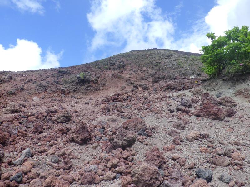 ⑤脊門丘へ一旦、下ると山頂までは再び、噴石のザレ場が続く