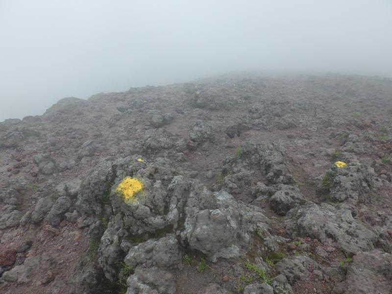 往路下山ですが、ザレ場部分はガスの中ではどこを歩いてきたのかほとんどわからず、黄色のマーキングを辿りました。