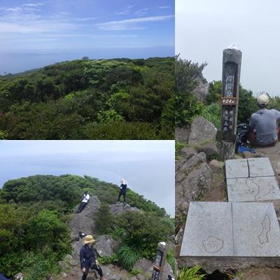 この先、6合目~7合目は噴出岩がゴロゴロ、8合目までは大岩が道をふさぎと歩きにくくなります。途中の展望台もまだガスがでていて、パスして山頂へ急ぎます。20人くらい抜いた後、山頂へ74分で到達。山頂でようやくガスが晴れそうで海岸線や屋久島が確認できました。山頂でも10人程度の先行登山者がいて、抜かしてきた人達もやってくるので、すぐさま下山します。下山時は山頂付近以外はガスが晴れてきて、展望所でも青い海が確認できました。もう少し待っててもよかったかなと思いましたが、なんせ暑いので、仕方ありません。下山は1合目まで下って同じ74分で終了。久しぶりに汗だくで、さっさと温泉へ向かいました。