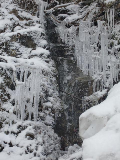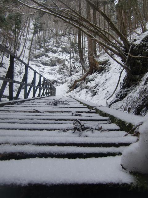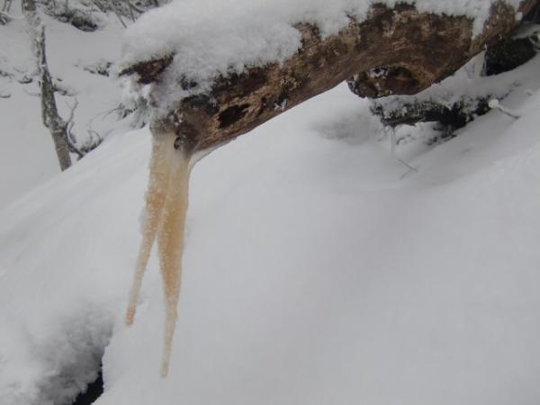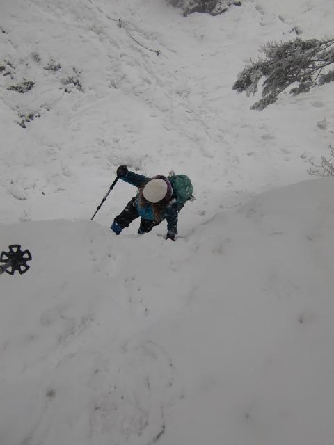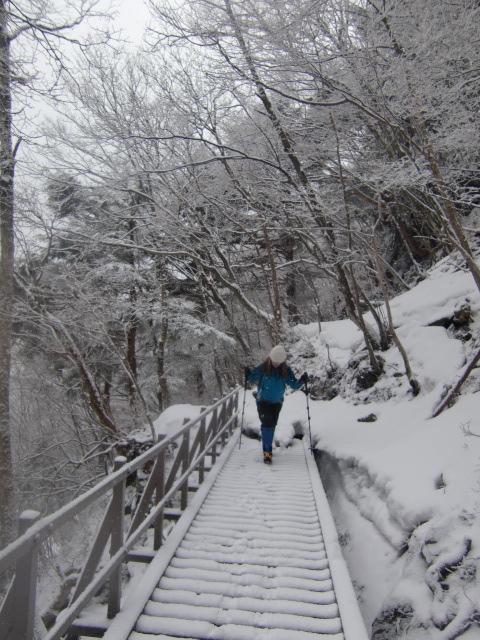 登り始めは、溶けてから凍ったガチガチの雪の上に、昨夜~当日にかけての雪が