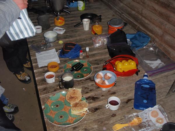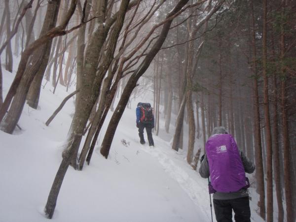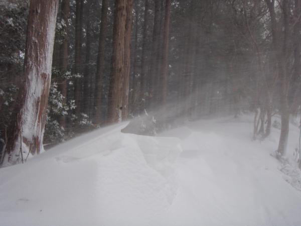 樹林帯の中までも吹き抜けるような暴風が終始吹いていたため、頂上手前の避難小屋で豪華な昼食パーティーをして下りてきました。