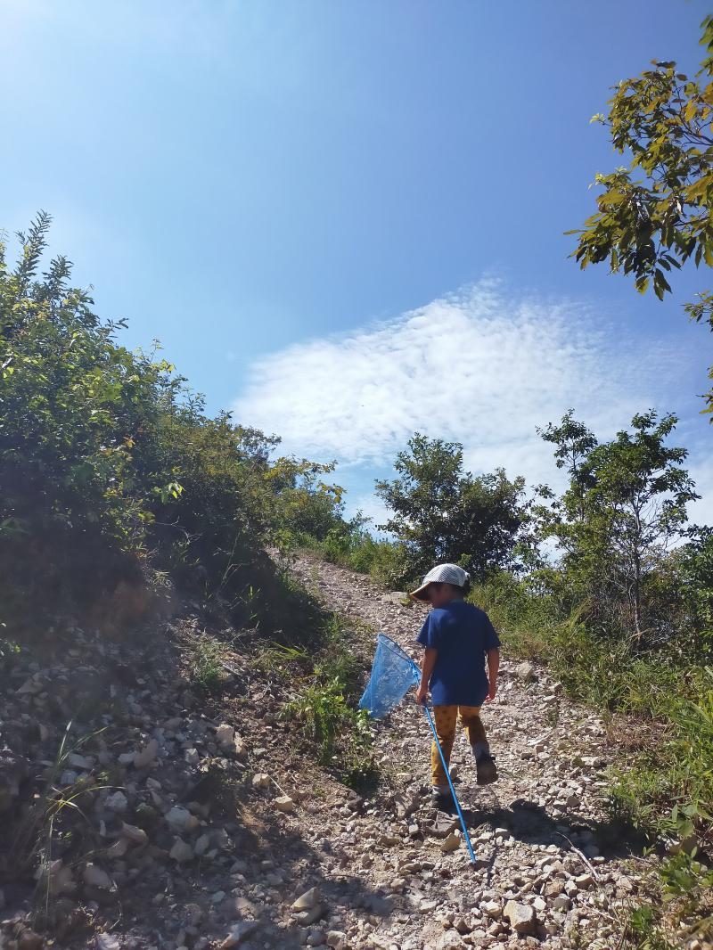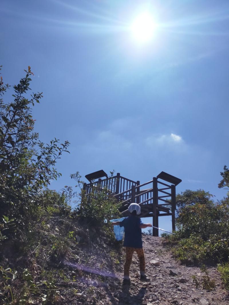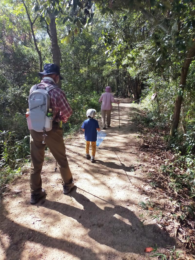 朝晩少し涼しくなったと思い低山に両親と子供とで出かけましたが、まだまだ暑かったです。いつもの仕事と同じ服装でまずは息子とウォーミングアップがてら2キロウォーキング。