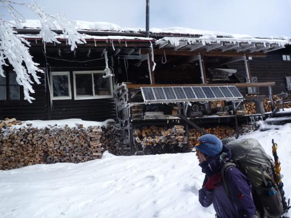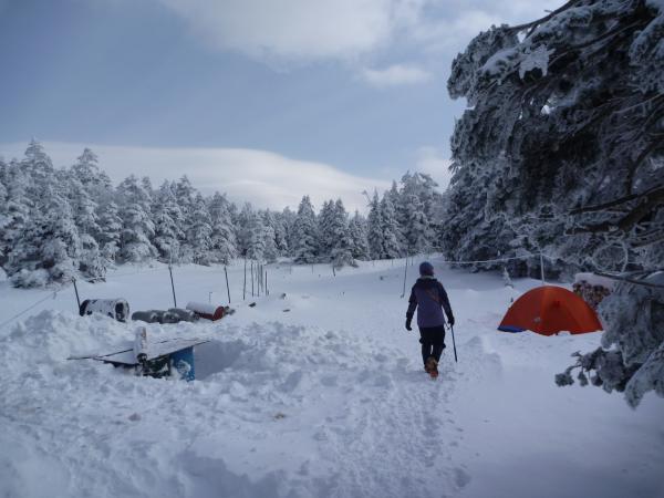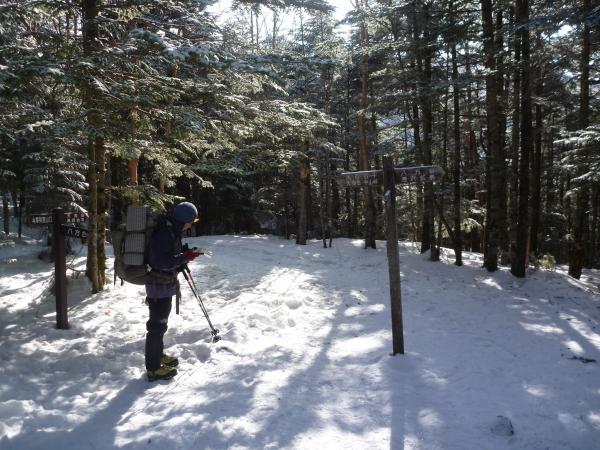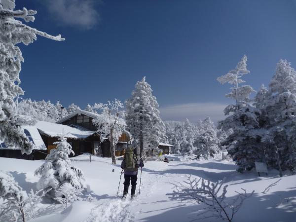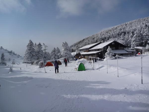 硫黄の香りが漂う渋の湯から八方台分岐までのほどほどな斜度を登り、冷えた体がようやく温まってきた。ここで小休止をとり、さらに1時間少々樹林帯を歩くと黒百合ヒュッテに到着する。テントの受付(1人1000円)を済まし設営を開始。時間に余裕もあり天気も良かったので、ここで不必要な荷物はテントにデポし、アイゼンを装着しストックからピッケルに持ち替え・・いざ天狗岳へ。
