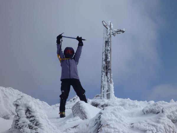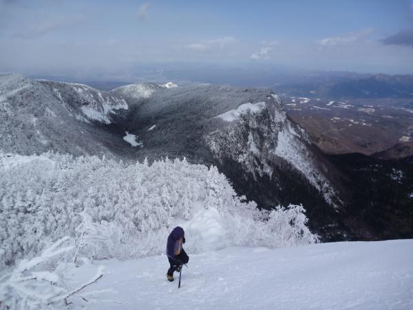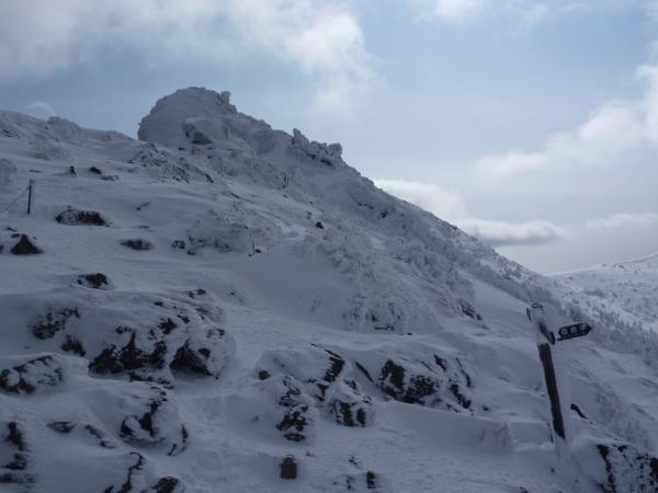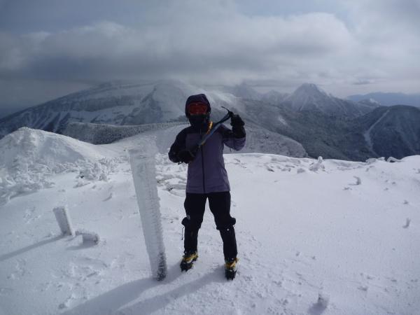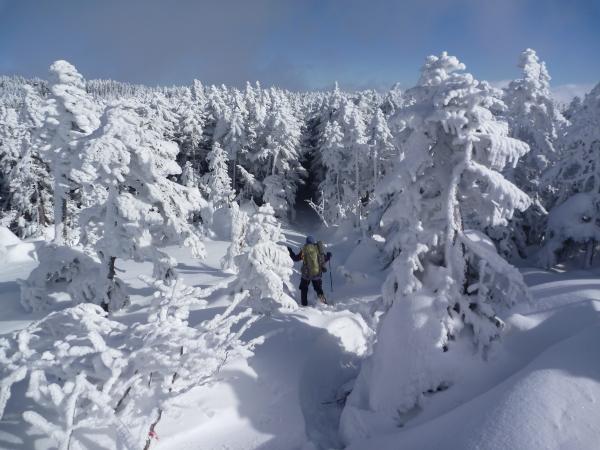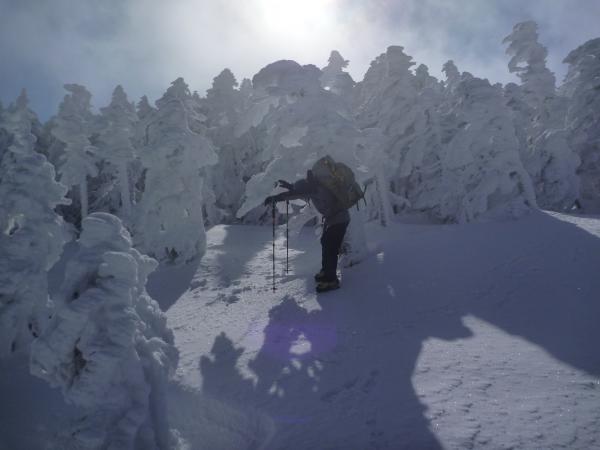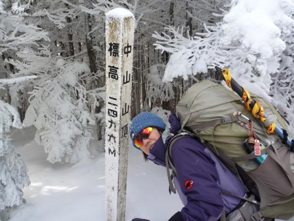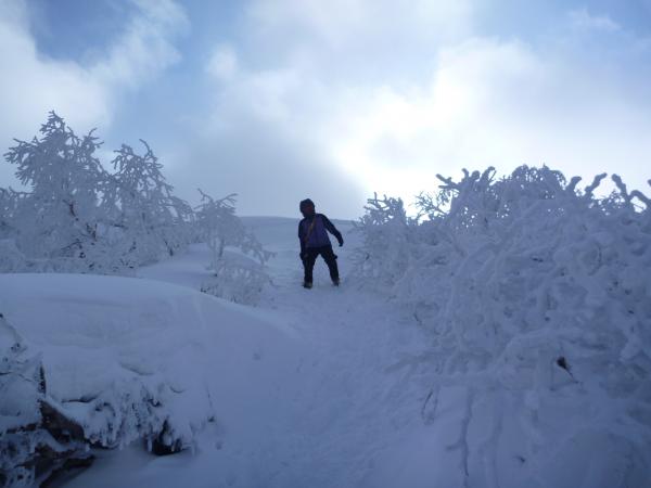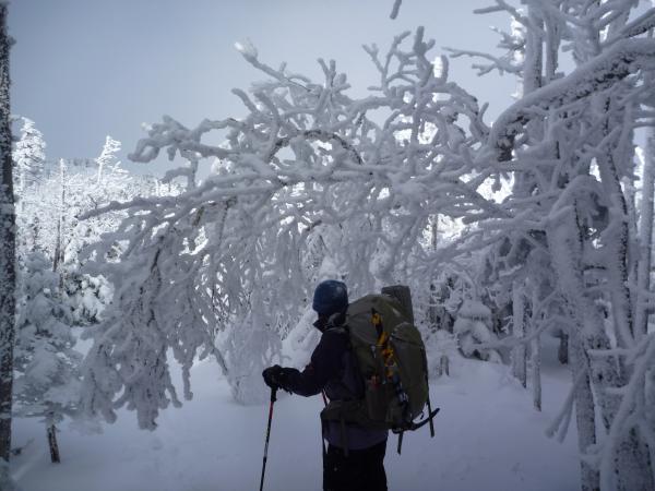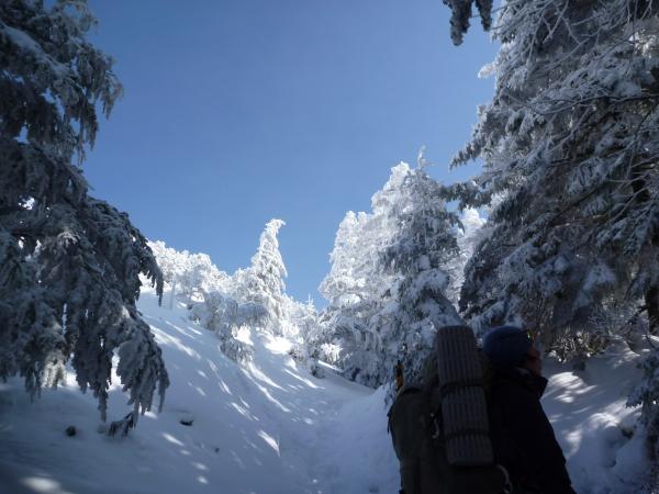 テント撤収して荷作りを済まし、出発。中山峠を左にとり高見石小屋に向かう。樹林帯の中をほどよく登り開けた場所に出ると“中山展望台”だ。そこでちょいと休憩。辺りは雪を身に纏った木々たち。蔵王とまではいかないがこれも立派な“モンスター”??その前で記念に一枚(下の写真を参考)。また樹林帯に入り小屋までは下り坂。