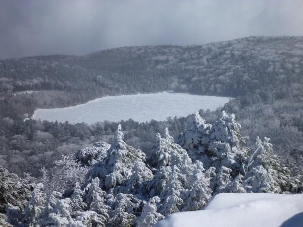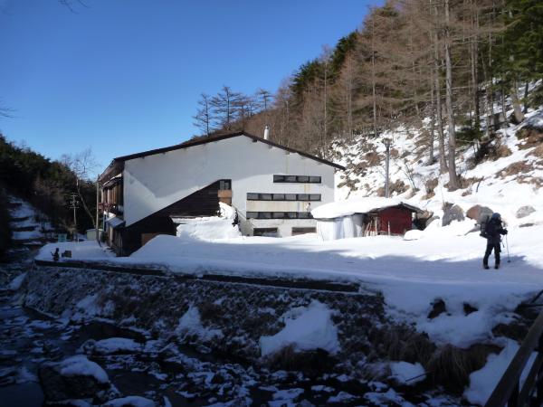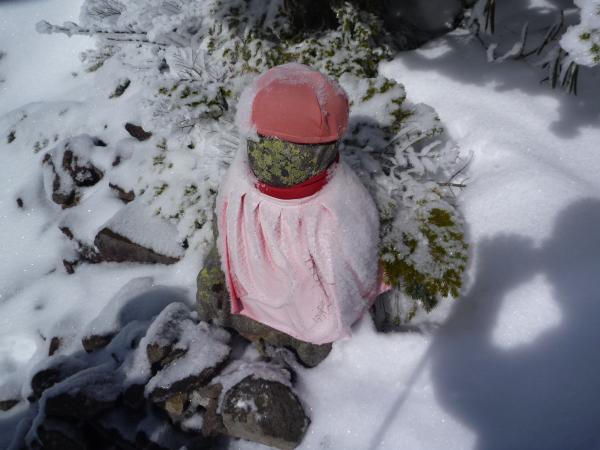 高見石小屋に到着し、休憩。小屋の裏が展望台になっていて、白く凍った白駒池と赤い屋根の白駒荘が見える。展望に満足して小屋に戻り、再び下山を開始。樹林帯を通り開けたところに出ると“賽ノ河原”だ。遠くに南アルプスの山容を見ながら下る。途中にいる地蔵仏さんに手を合わせ、一気に渋の湯まで下りきった。