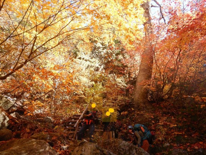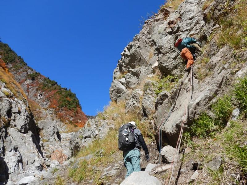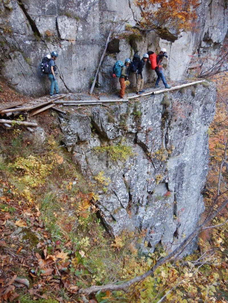 崩壊の高巻きポイントもクライミングチームは楽々こなします。