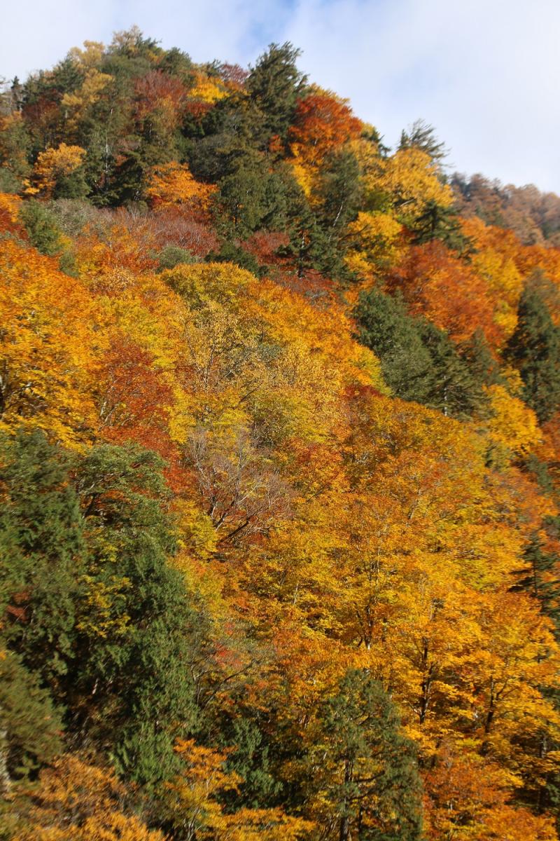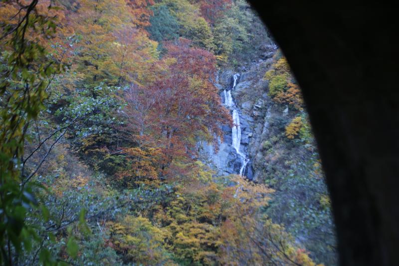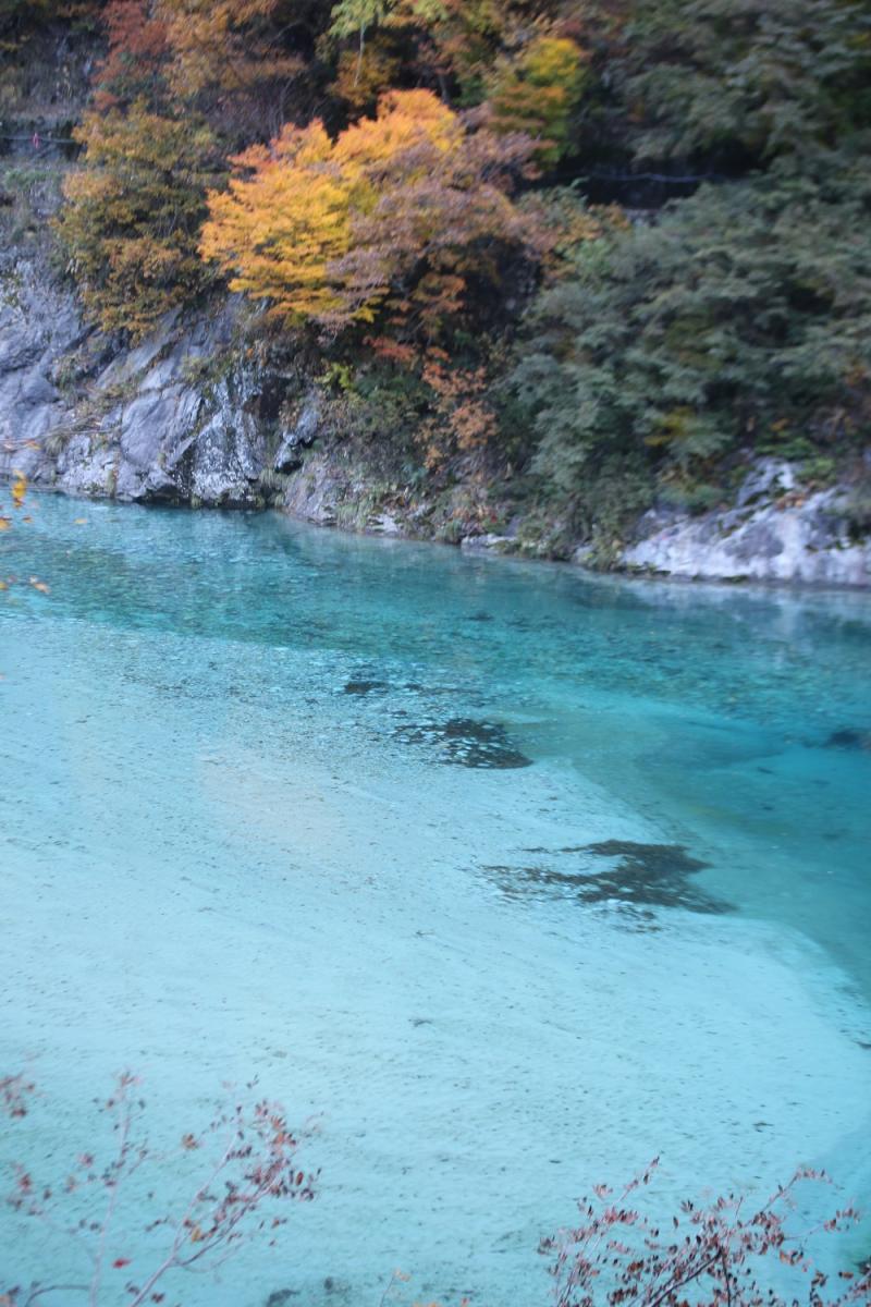 トンネルを通ると仙人ダムになり、エメラルドに輝く川面と紅葉はシャッターが止まりません。