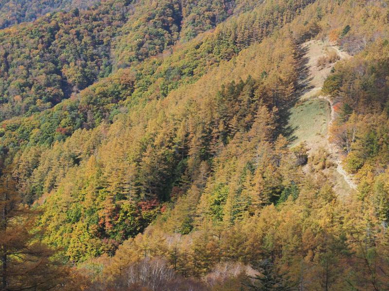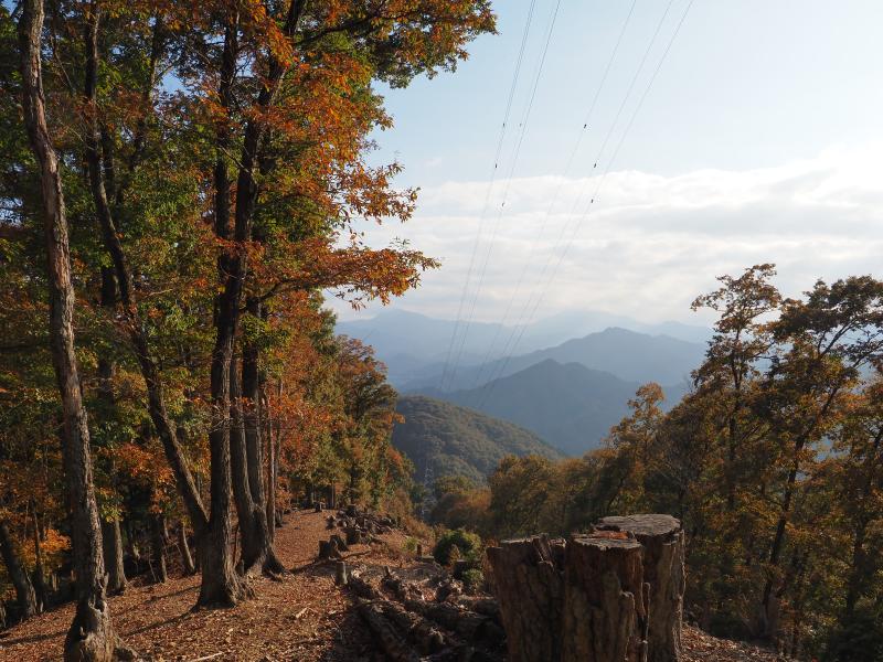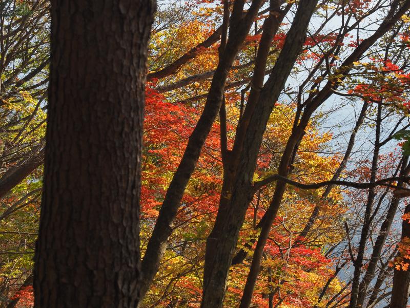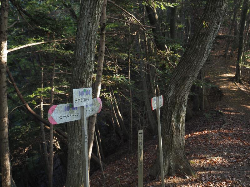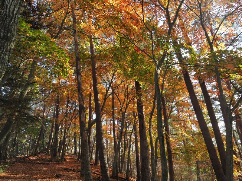 金山峠へ向かう途中、雁ヶ腹摺山取り付き点付近の一瞬開ける場所がありますが土砂崩れなのかちょっとわかりにくくなっていました。金山峠〜セーメーバン〜サクラ沢峠は紅葉が綺麗でした。下りはグリップさせすぎず滑らせつつ軽快に下ります。遅能戸のバスに乗れそうなのでサクラ沢峠でエスケープ。姥子山以降は人にも動物にも会わずでした。