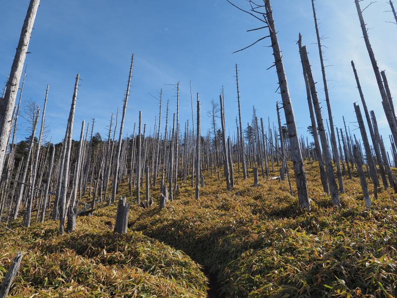 牛奥ノ雁ヶ腹摺山は以前、大菩薩から繋いで歩きましたが、昆虫館からのルートはお初。山頂手前で急に縞枯現象で展望が開け、富士山、南アルプス、奥秩父、八ヶ岳等々見える素晴らしい景色。一旦大峠に下りて、雁ヶ腹摺山へ。前半は苔や針葉樹の森、後半は紅葉樹の森。大峠は車でも上がってこれるので何台も止まっていました。雁ヶ腹摺山へは始めはトラバースが多く、その後は尾根を直登。旧500円札の富士山撮影地である雁ヶ腹摺山ですが雲が上がってしまい富士山が見えず…まぁまぁ人がいたのでそのまま姥子山へ。姥子山手前は若干痩せ尾根。こちらは人がいなかったので昼休憩します。こちらも富士山は見えず。小金沢連嶺も雲に覆われてしまいました。