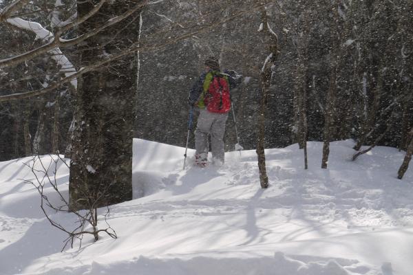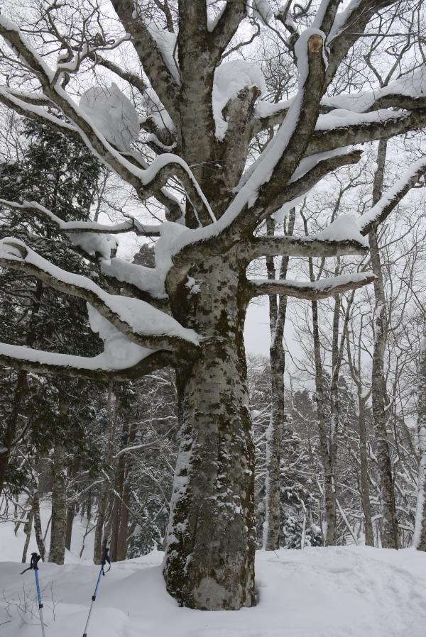ミズナラやブナの巨木を眺めながらスノーシューでのんびり気持ちよく歩けました。