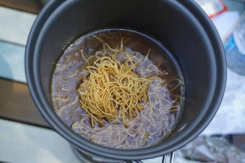 まずはお湯を沸かしてアルファ米を戻し、その間に『淡路島産玉ねぎのオニオン・スープで作るあつあつ台湾きのこ麺線&ぼっかけルーロー飯』の調理開始。
