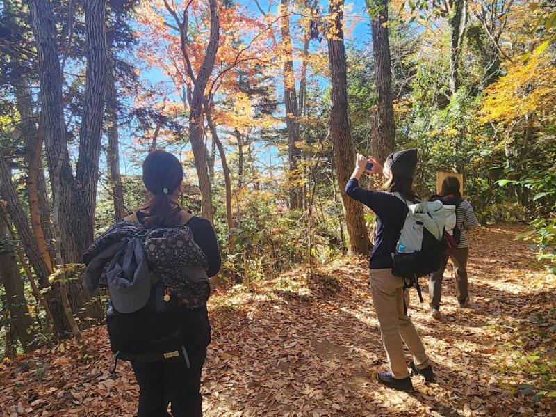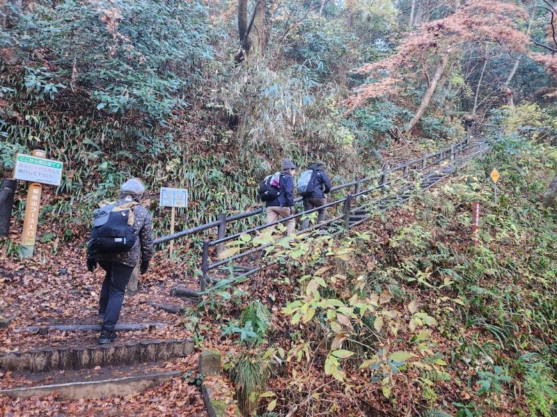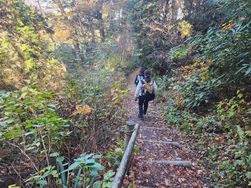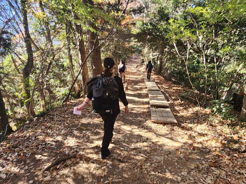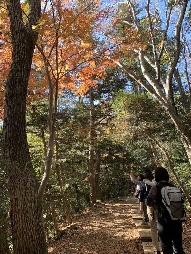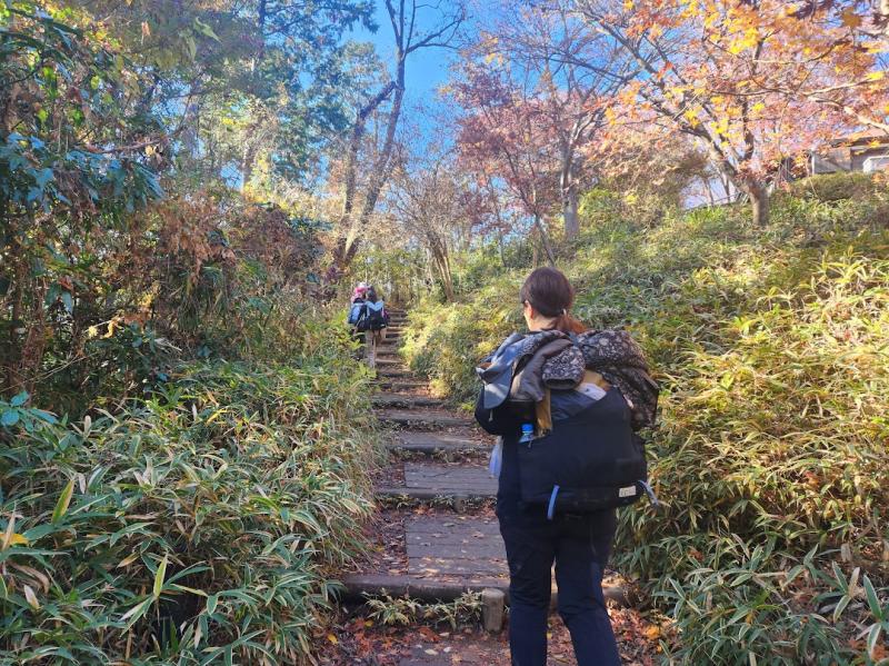 この日のルートは稲荷山コース。ケーブルカーの左横を歩いて山頂まで行くコースです。急な箇所はなく所々木段が敷かれていて歩きやすく、途中の紅葉をゆっくりと楽しみながら向かいました。