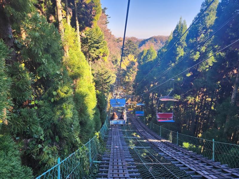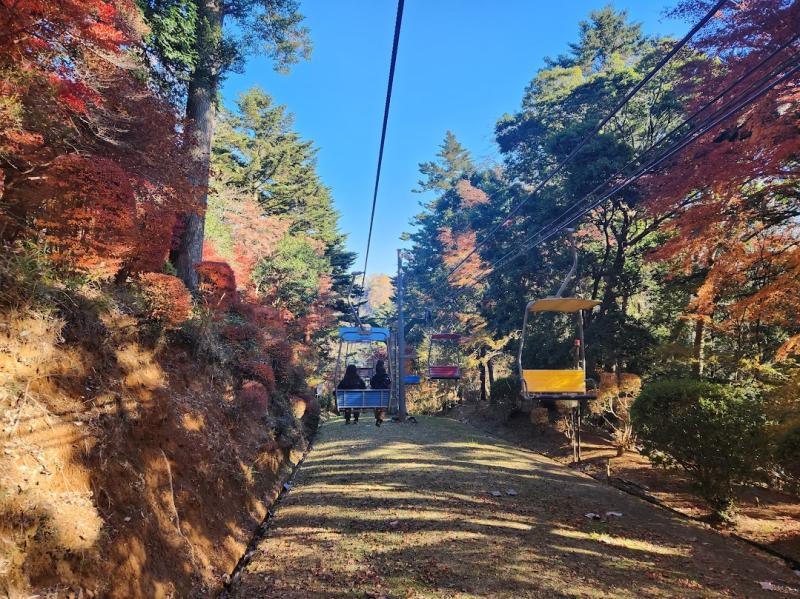 薬王院の門まで歩いたら、下りのお楽しみリフトへ乗り込みました。高尾山はケーブルカーの横にリフトコースもあり、景色を間近に見ながら解放感のある下りを楽しめます。乗り物好きにはたまらないアトラクションでした。