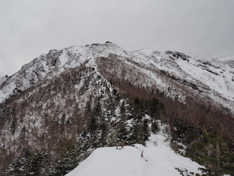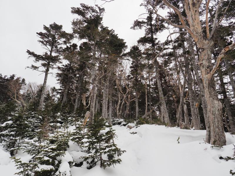 標高2300m辺りを過ぎると雪の量が増えてきて少し滑るようになってきたので標高2400m辺りでチェーンスパイクから12本爪アイゼンに換装。先行者はなしなのでカモシカの足跡かな?展望台まで来ると赤岳、三叉峰、横岳が良く見えます。ちょっと高曇り。展望台でピッケルを出します。この先三叉峰まではまさかの脛~膝ラッセル。