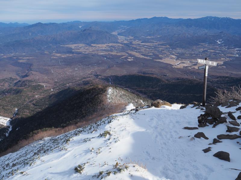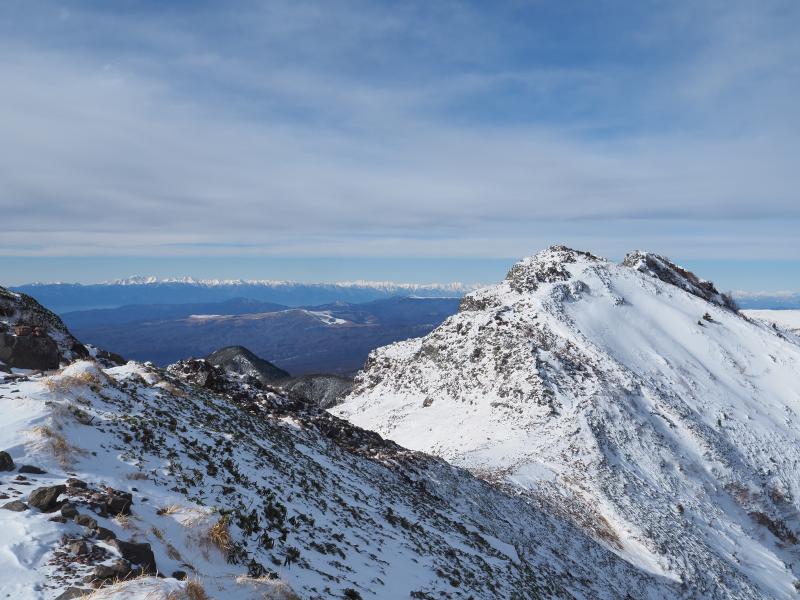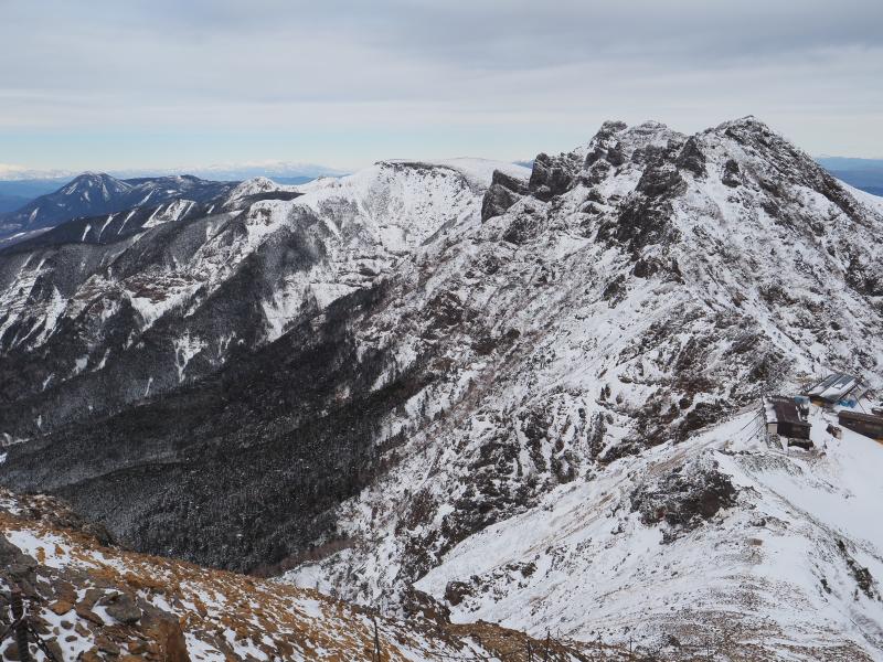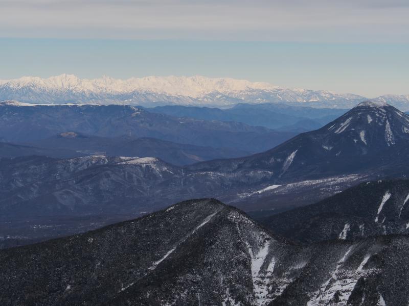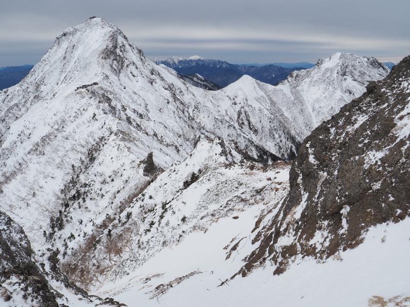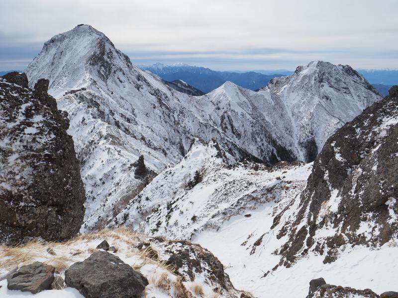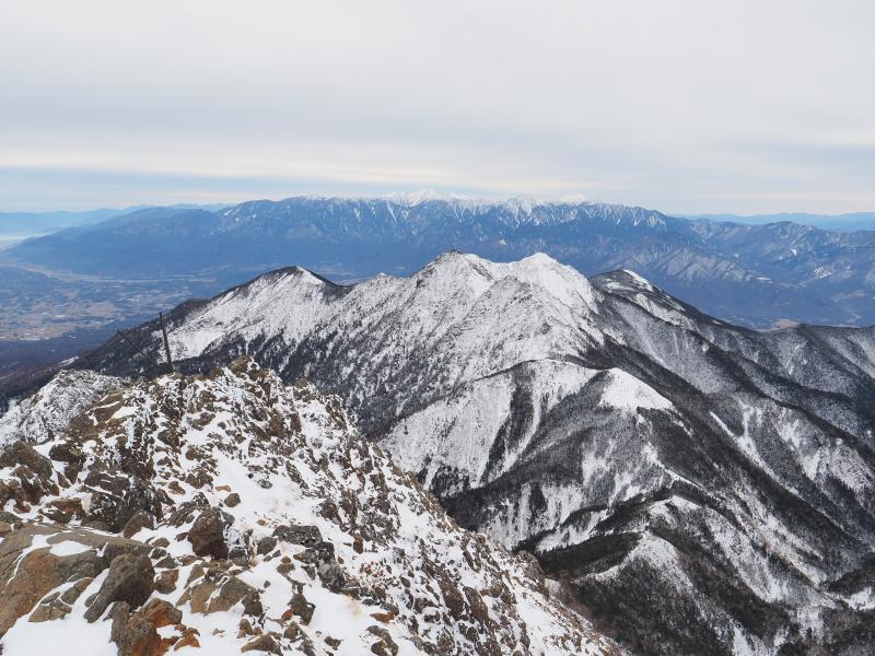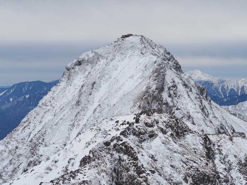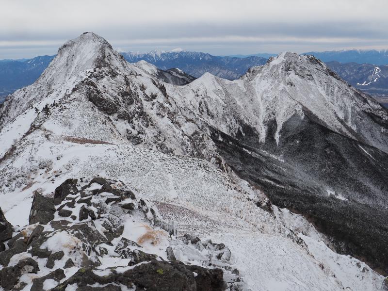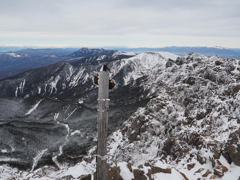 三叉峰で写真を撮ってると太陽が見えだしたので赤岳まで行きます。地蔵の頭までは梯子や鎖、岩場が連続します。稜線は雪がしっかりあるところと、岩の上に少し雪が乗っているだけのところと差があり、なかなか歩きづらいです。日の岳のルンゼはしっかり雪で埋まっています。赤岳手前の斜面も岩の上に薄く雪が付いている程度で歩きにくい中登りようやく赤岳山頂に到着。相変わらず高曇りですが富士山・南アルプス・中央アルプス・北アルプスは良く見えていました。